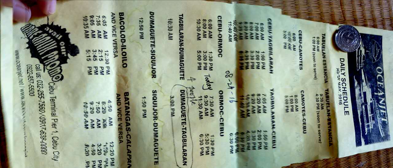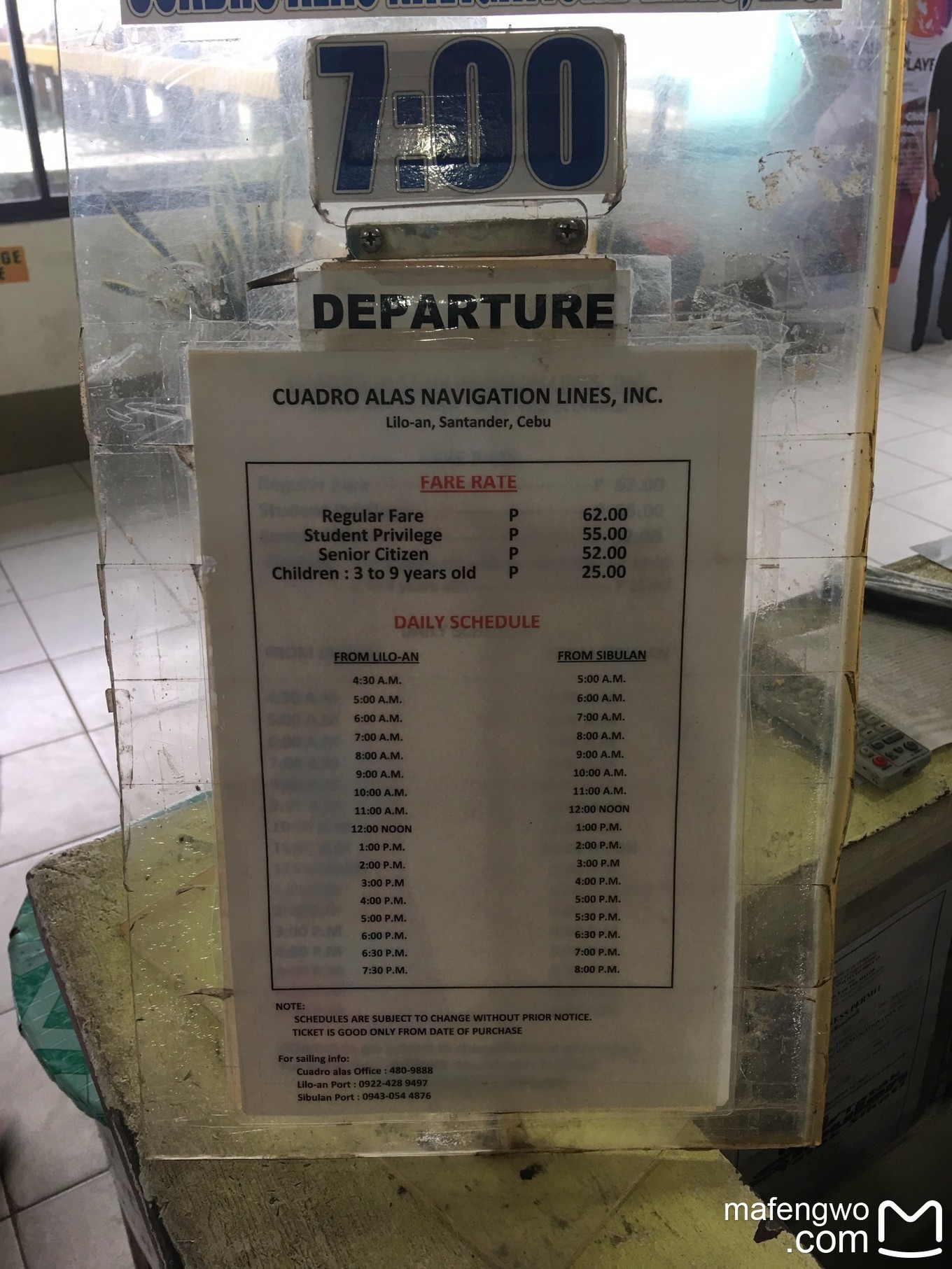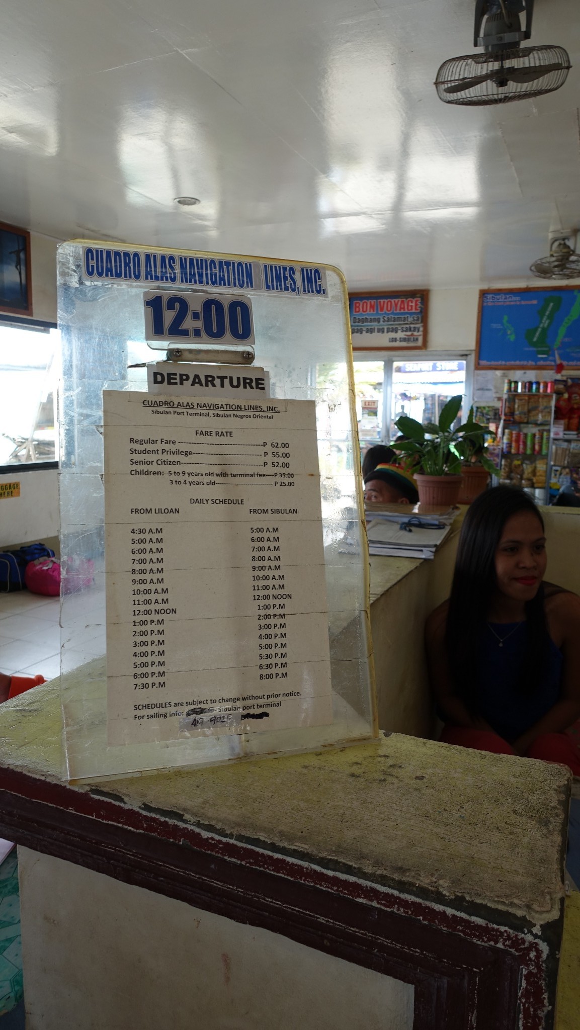 Oslob镇其实是在与杜马盖地隔海相望的宿务岛的最南端,但杜马过去的快船也挺多班次的。首先要乘tutu或者双条或者大巴到达杜马机场附近的Sibulan码头,然后在候船室就能买票前往对岸的Lilo-an码头,船的班次非常多。