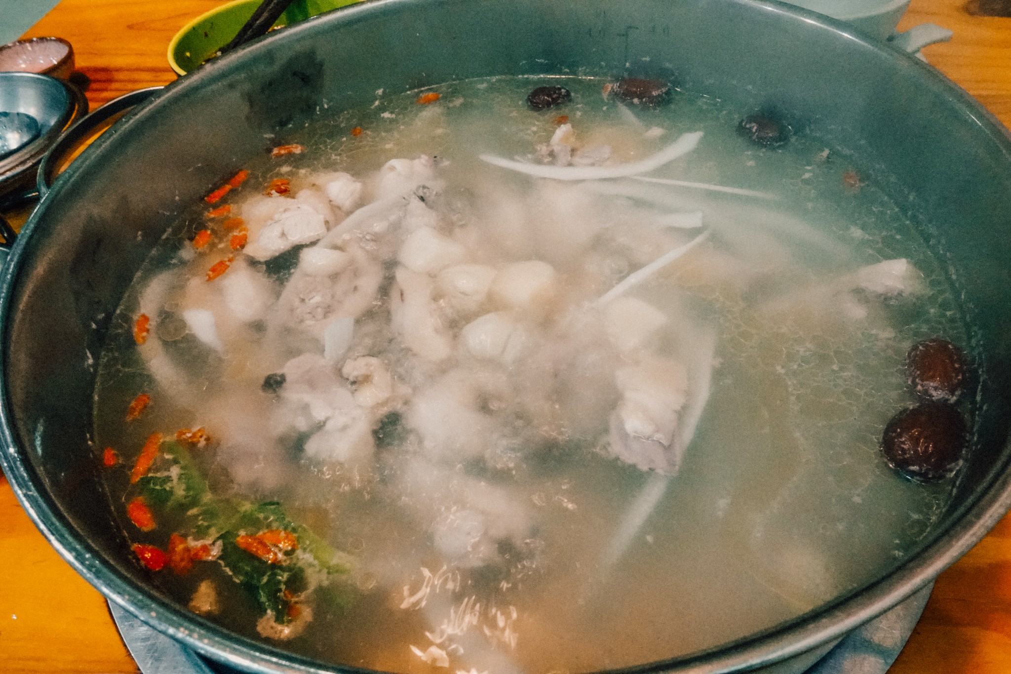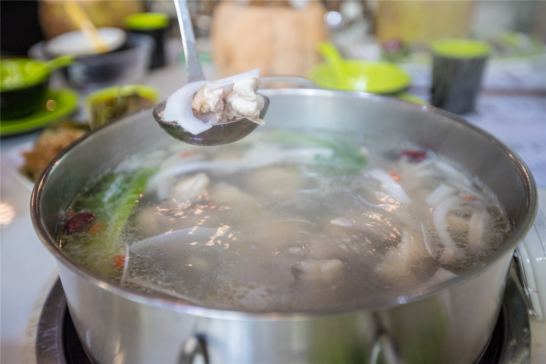 鸡肉选用的是海南本地的文昌鸡,养足180多天,这个时候的鸡,肉质紧致,鸡皮爽脆,能看到皮下金黄的鸡油,食用正好。汤底烧开后,鸡肉下锅,每张桌子都有一个计时器,严格把控时间,约莫3分钟,便能喝汤吃肉了