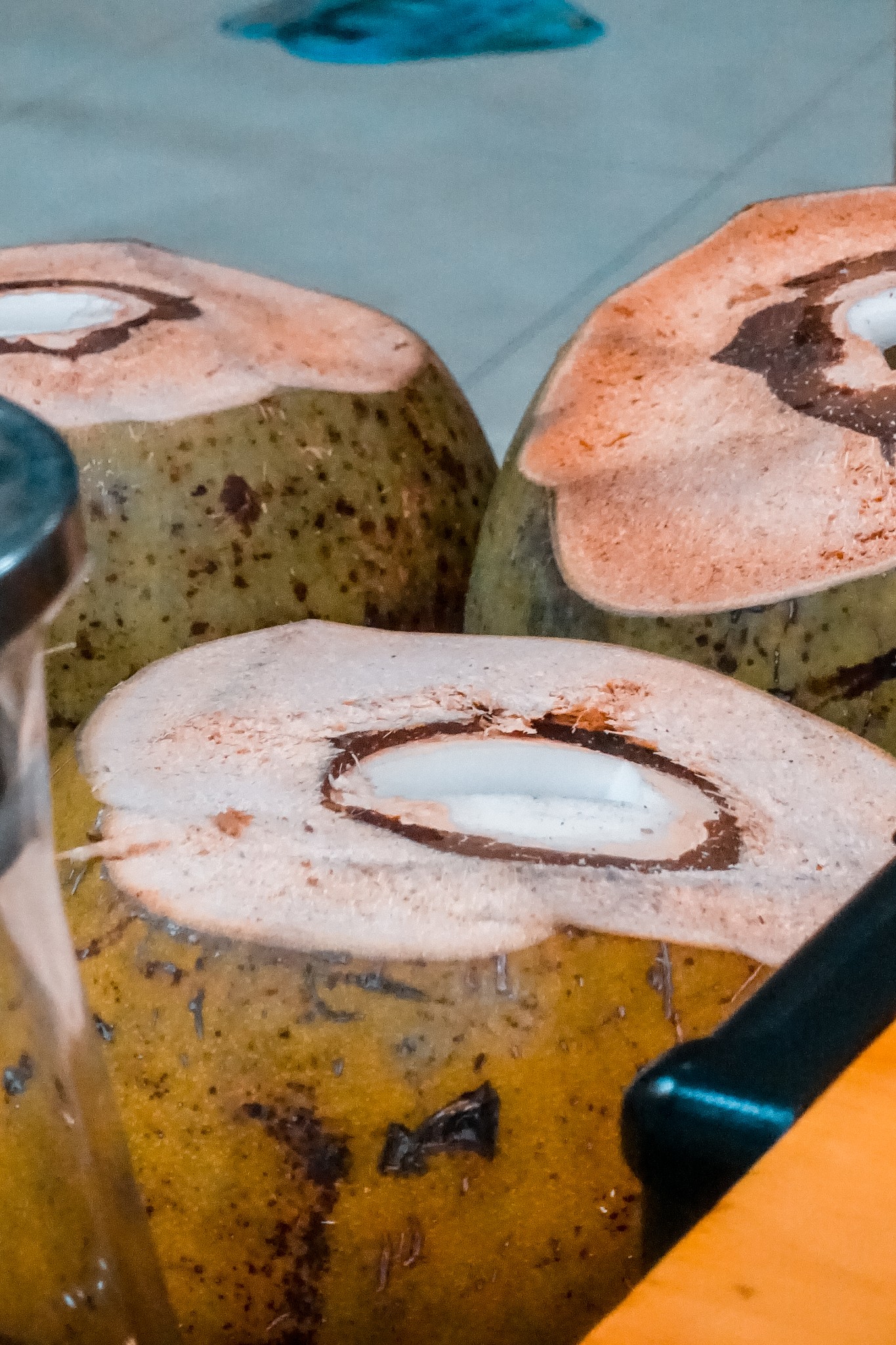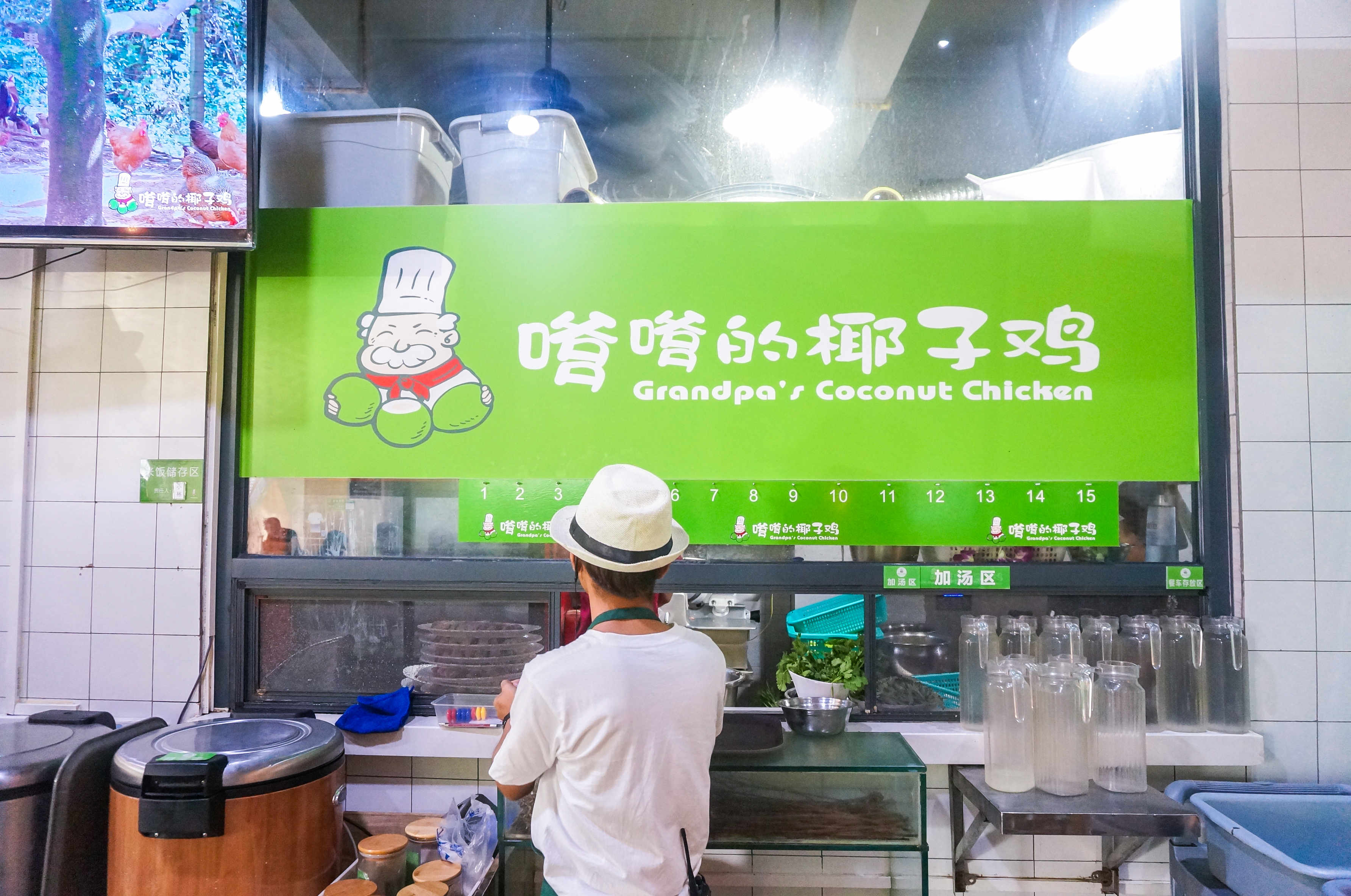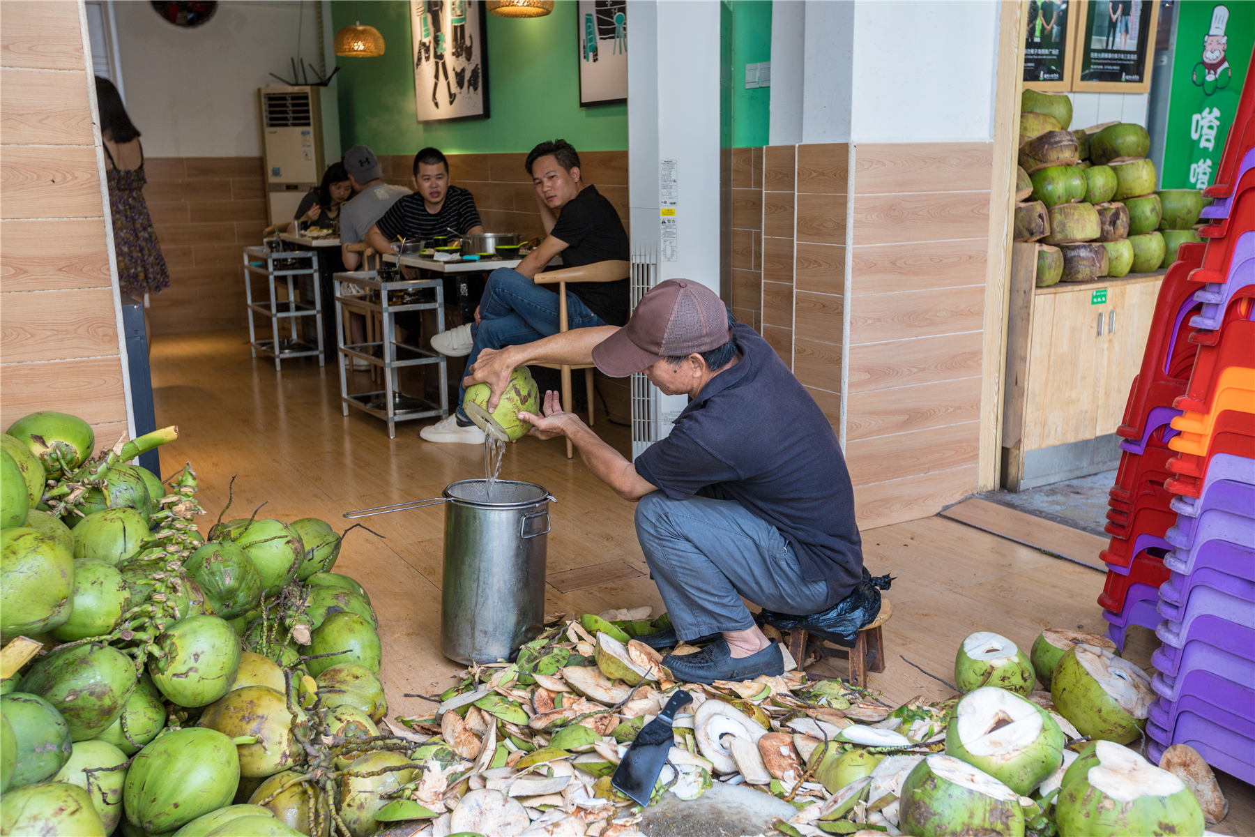 嗲嗲的椰子鸡不愧是“网红店”,停好车到达餐厅差不多八点了,依然是生意火爆,在我们的前面还有好几桌在排队。大伯在餐厅门口用专用的刀在砍椰子,他主要负责砍开椰子,取椰汁。眼前所看到的新鲜的食材都是最新鲜的食材。