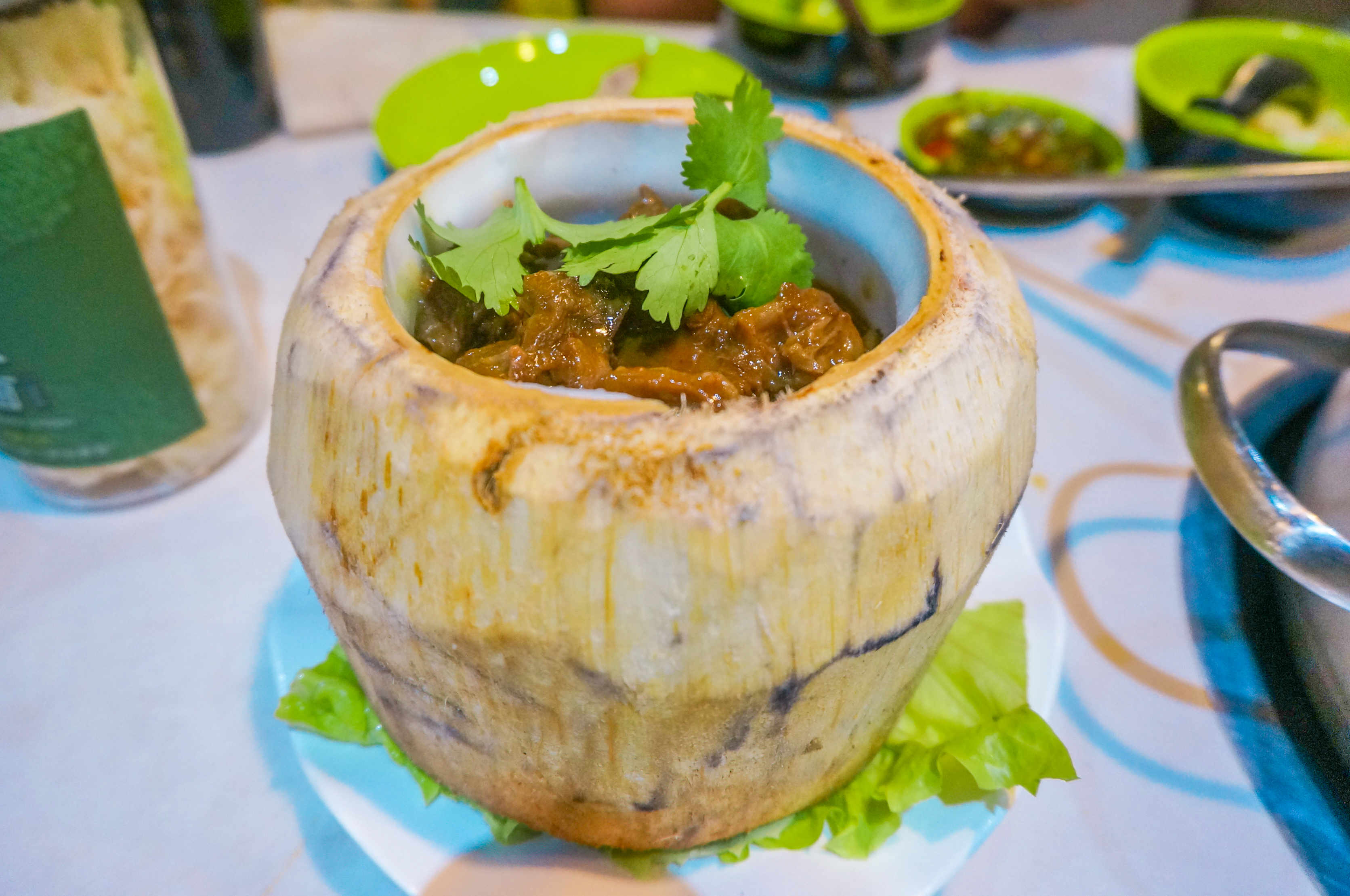 广东人对牛腩煲不陌生,但还是第一次吃装在椰子里的牛腩煲,果然很有海南特色!牛腩和牛筋,加入嗲嗲的秘制酱料和椰汁炖烂后,再装入老椰子壳中。牛腩十分劲道,刚好锁住了浓厚的肉汁,带着浓浓的椰香,满分!