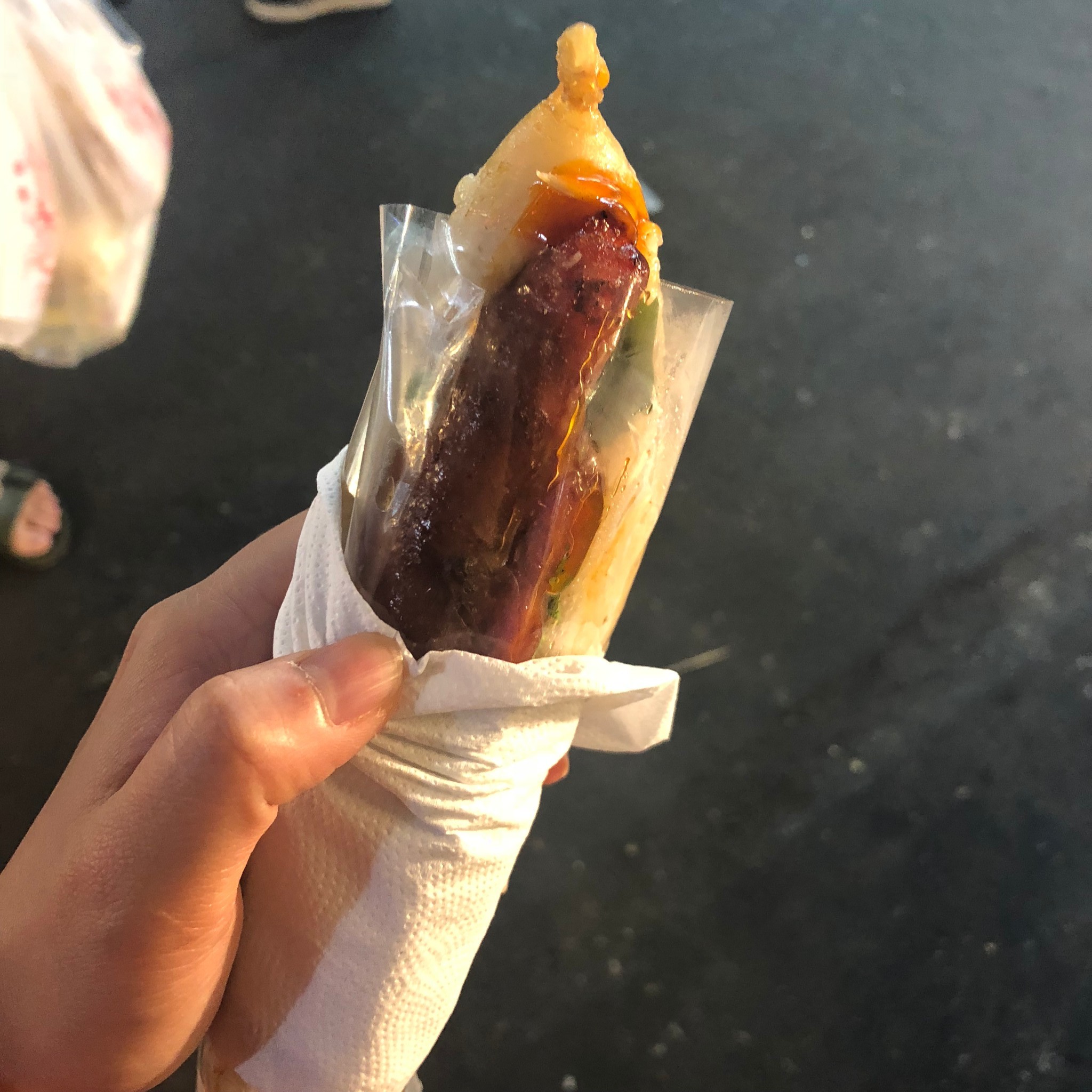 原计划是去六合夜市,因为就在住的民宿附近,不过民宿的台湾帅哥说瑞丰夜市更适合年轻人去,于是临时改变计划去瑞丰夜市,坐捷运到巨蛋站1号出口,出来走200米左右就到了。听某人说,七里香是夜市很出名的一道美食,我当然不想错过,于是找啊找,终于找到了,也吃上了,而且当下真的觉得味道很好。大肠包小肠外面那一层其实是糯米饭,夹着根香肠。