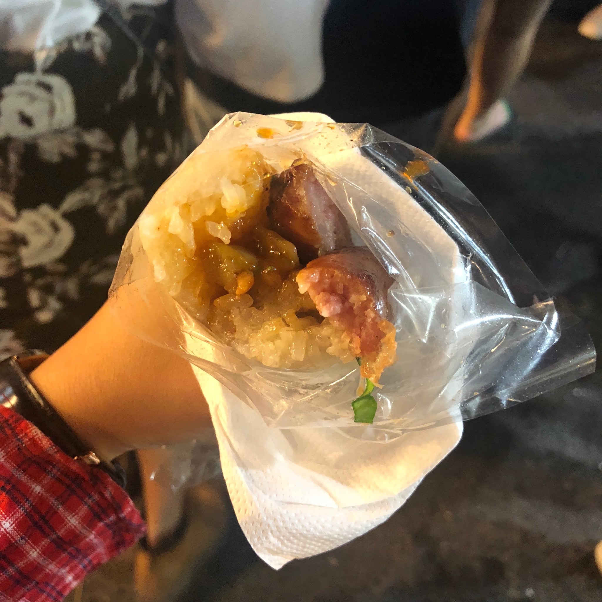 听某人说,七里香是夜市很出名的一道美食,我当然不想错过,于是找啊找,终于找到了,也吃上了,而且当下真的觉得味道很好。大肠包小肠外面那一层其实是糯米饭,夹着根香肠。