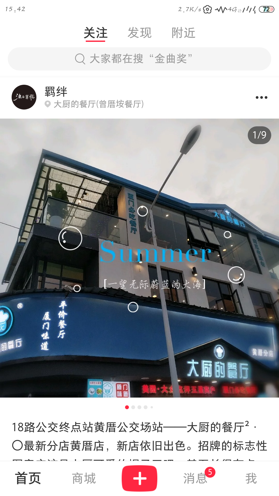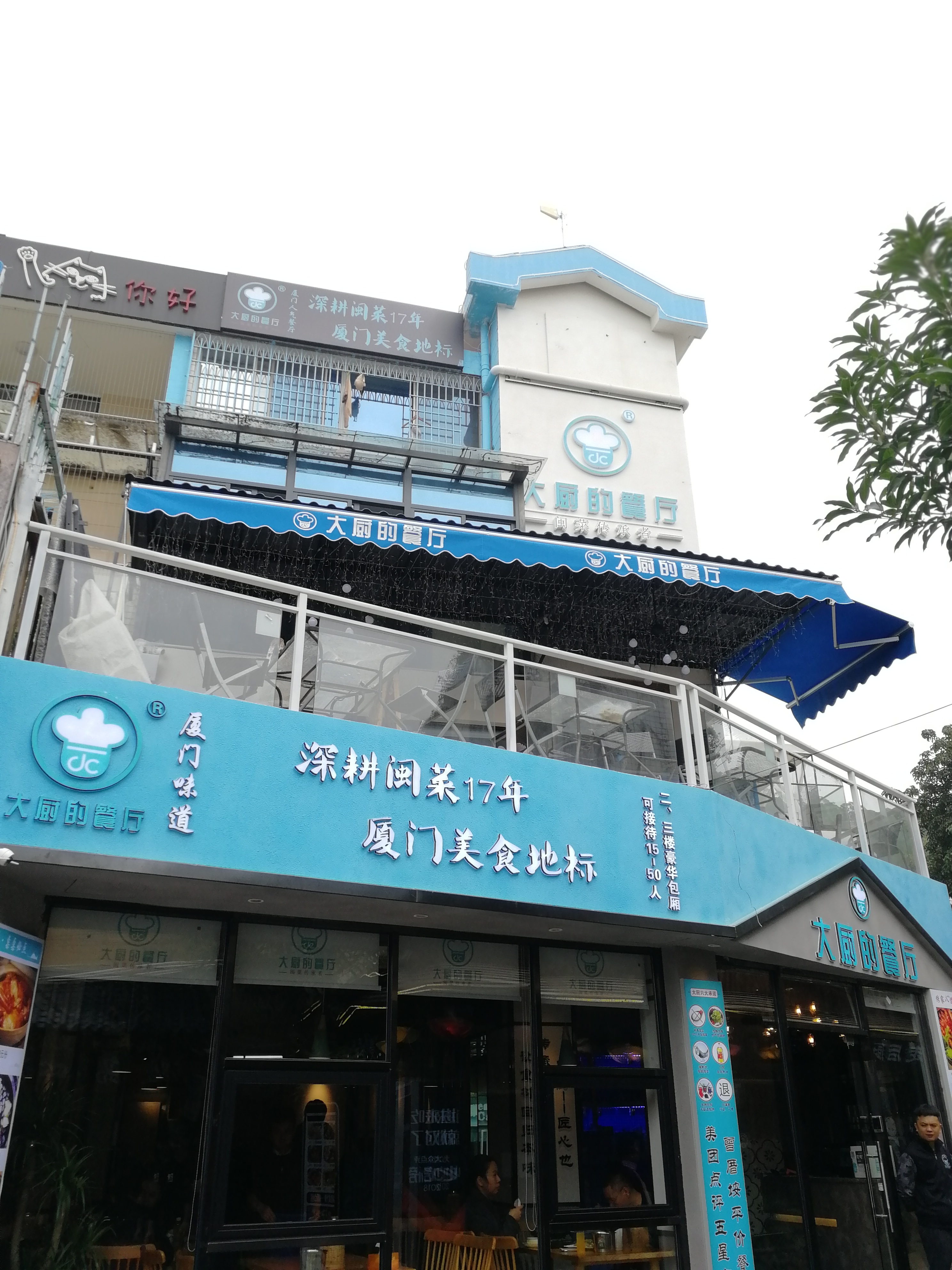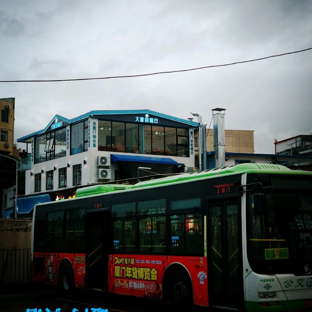 18路公交终点站黄厝公交场站——大厨的餐厅²·〇最新分店黄厝店,新店依旧出色。招牌的标志性图案应该是大厨可爱的帽子了吧,甚至长得有点像百度的脚丫风格不变,只是感觉地理位置更棒,规模更大更贊咯。瞧这装饰外观一遍干净的蔚蓝与白,与海对望,是海的蓝是天空的蓝是白云的白是希望的颜色。是梦见你时的满心欢喜