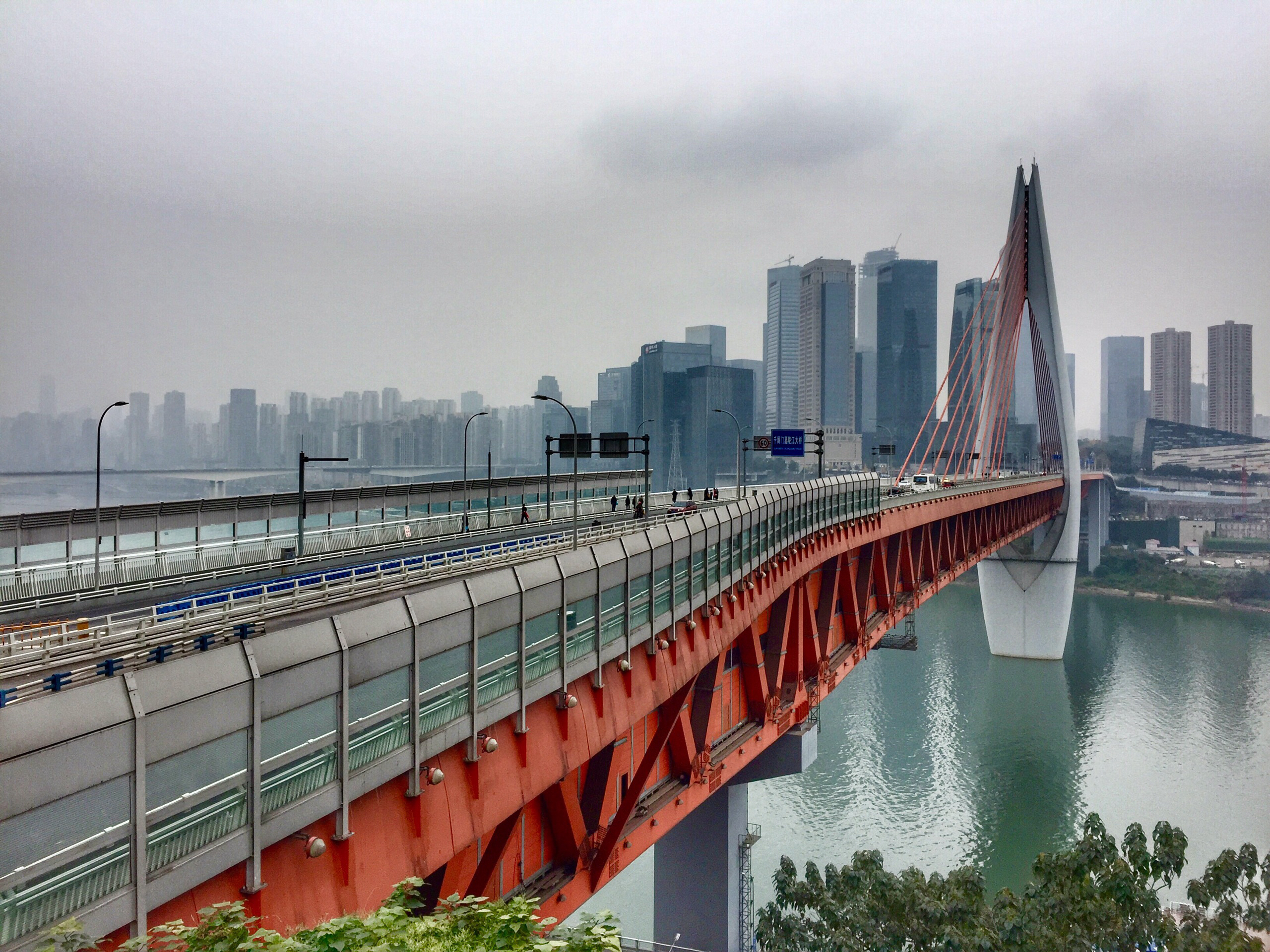 ·大桥分上下两层,上层为双向六车道,行人可经两侧人行道上桥;下层则是双向地铁轨道。