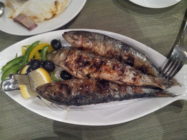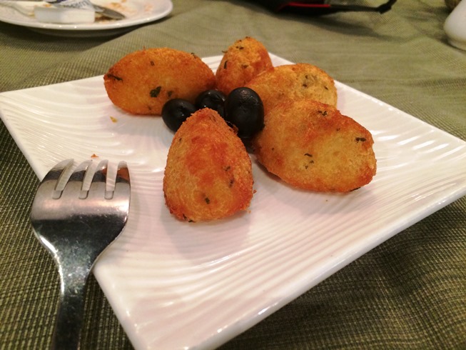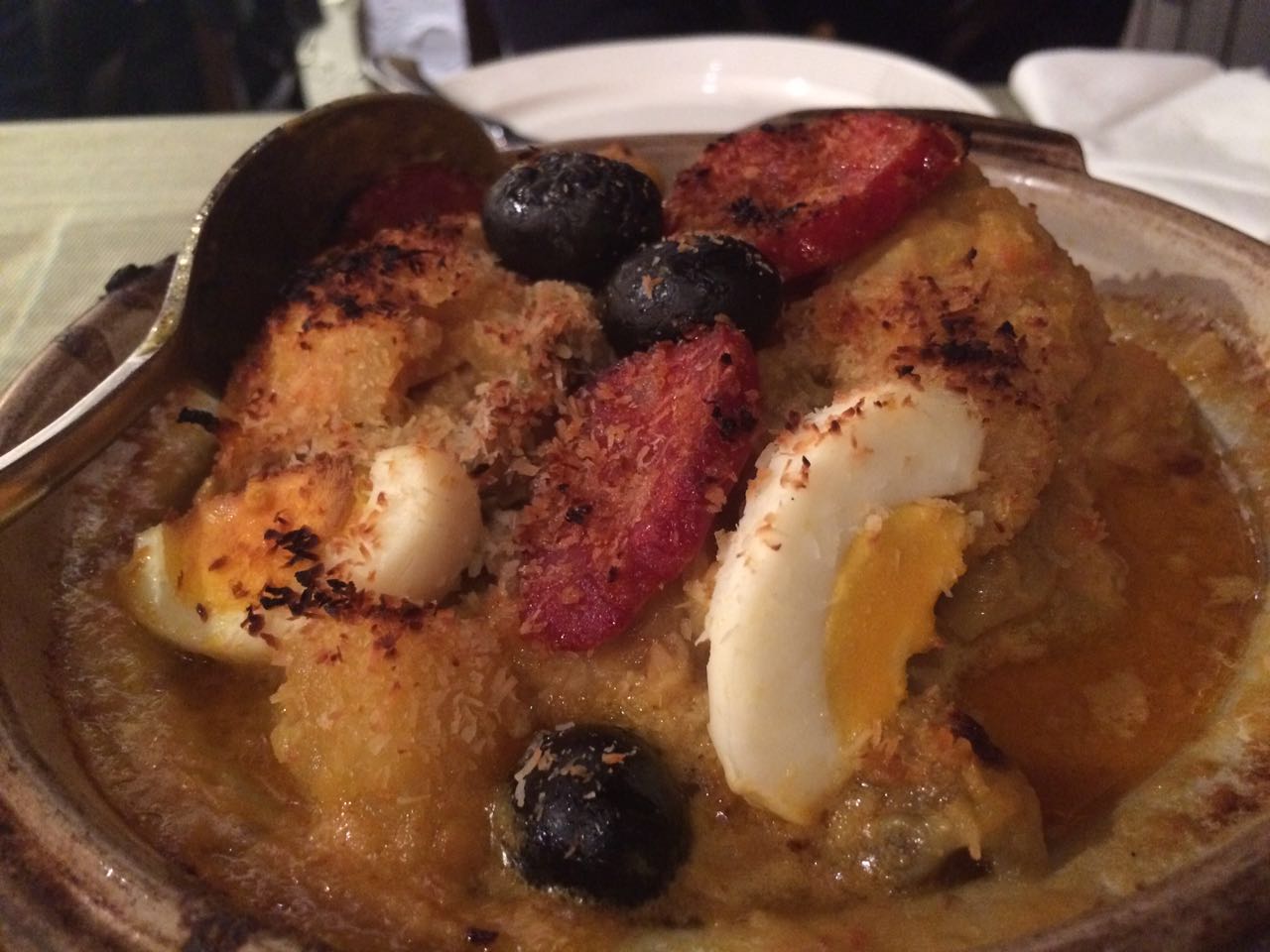 因为离吃过早餐自助餐的时间不长,我们其实都不饿,而且还送餐前面包,于是只点了两道推荐菜:葡国鸡和马介休球。马介休据说是一种葡国菜里很常见的鱼,但大约因为我们点的是“球”,上来的是几个感觉像鱼肉味的土豆,不过味道很美,而且确实完全不像之前吃过的任何一种土豆或鱼类的口感。
