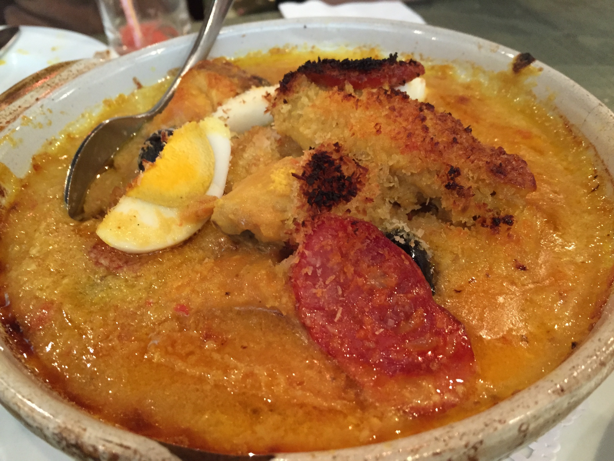 葡国鸡上的时间比较久,份量很大,还送了一大碗米饭。我们最后都吃不下了。来说鸡。葡国鸡的菜式外表有点像泰式咖喱鸡,口味不辣,有一种特别的辛香,好像带一点芝士,又好像有一些咖喱,感觉姜料不少,汤料的味道很浓郁。
