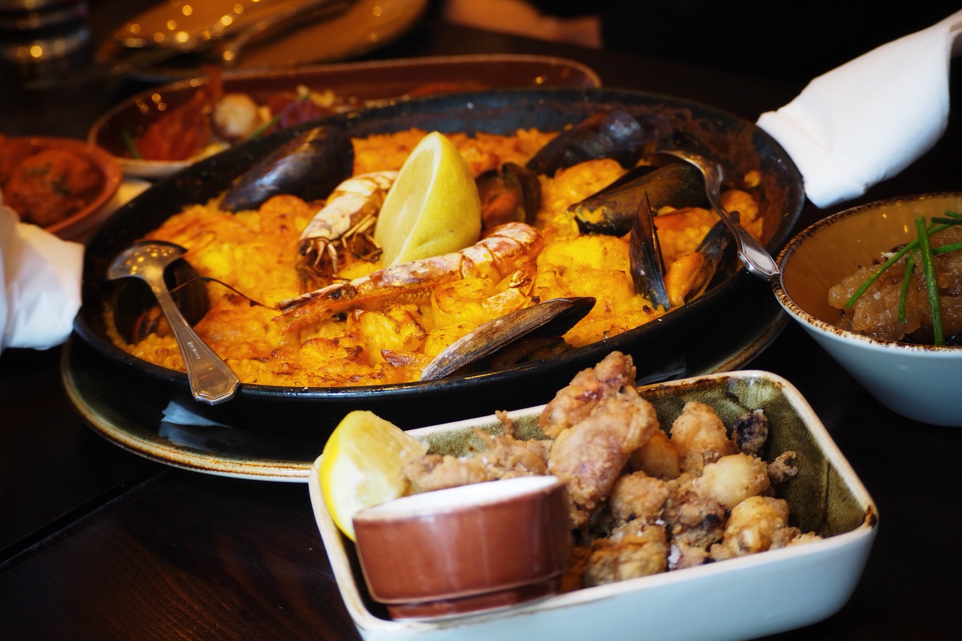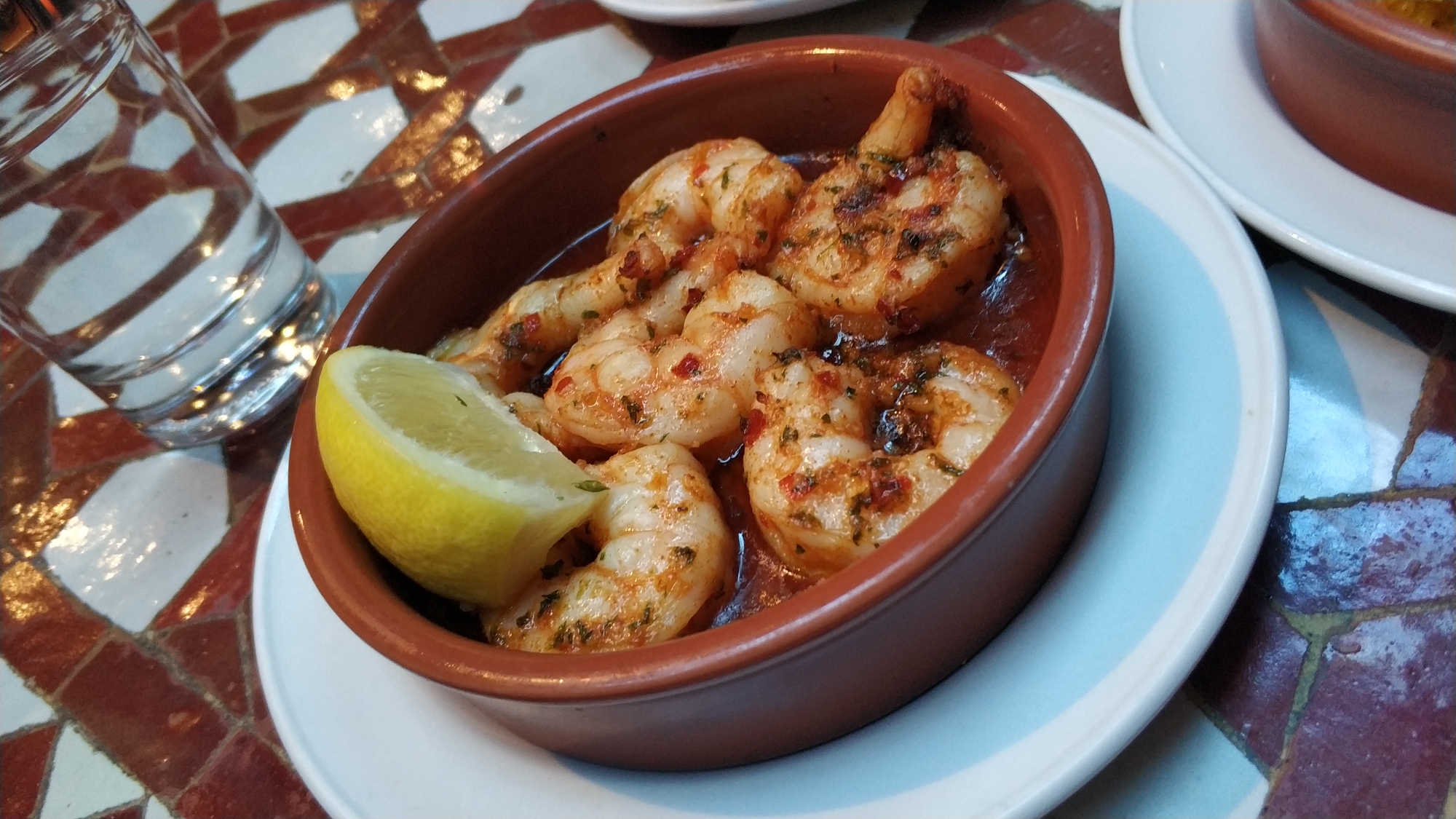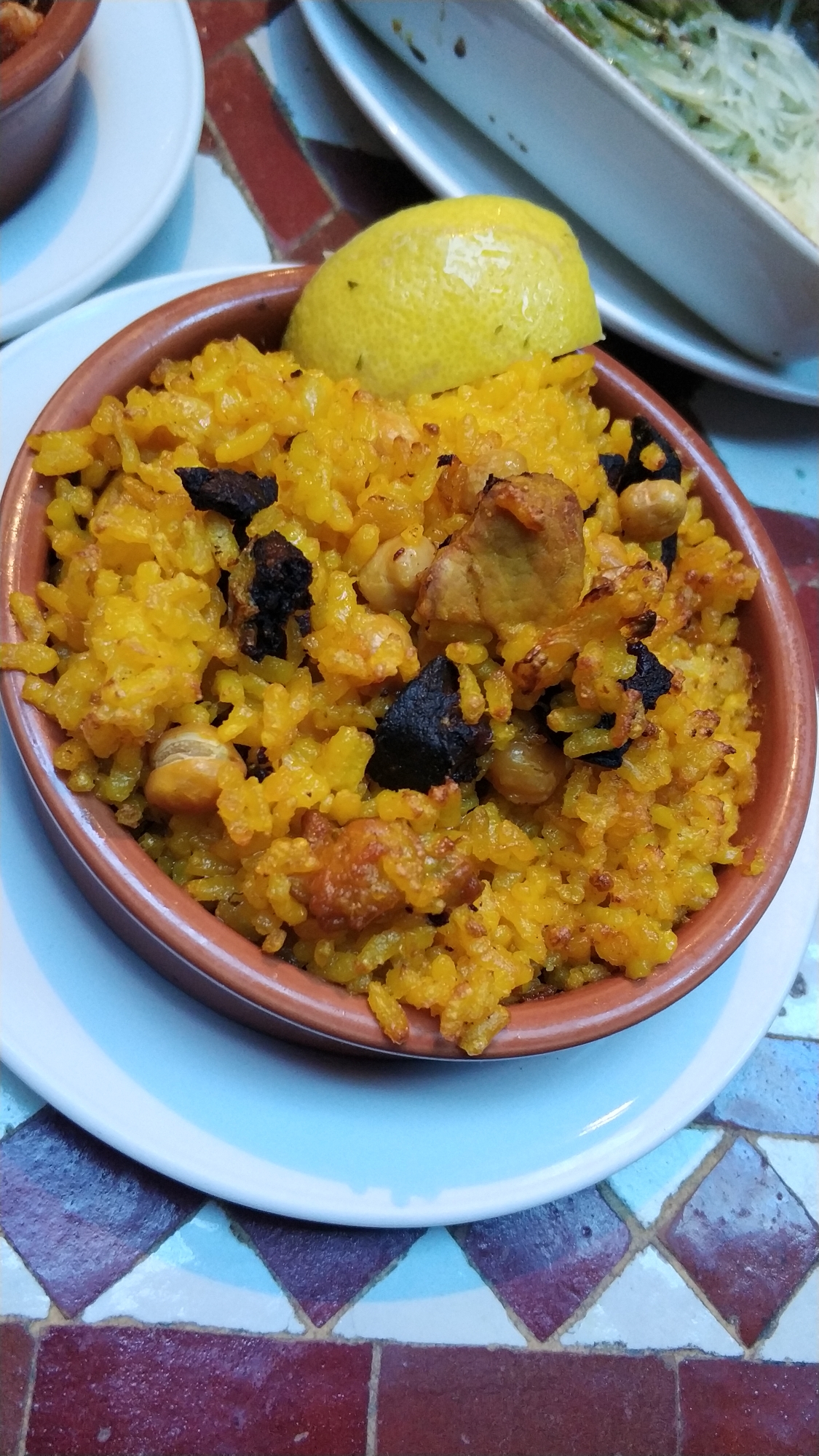 好多人说好吃,而且本地人中午老太太老伯伯很多都会去。桌面瓷砖…觉得好清洁啊哈哈哈。午市套餐3个TAPAS就14.95镑。某些要加收2镑一个。还是点了个饭,想吃饭。海鲜饭太大了,没法点…一人旅行没办法。