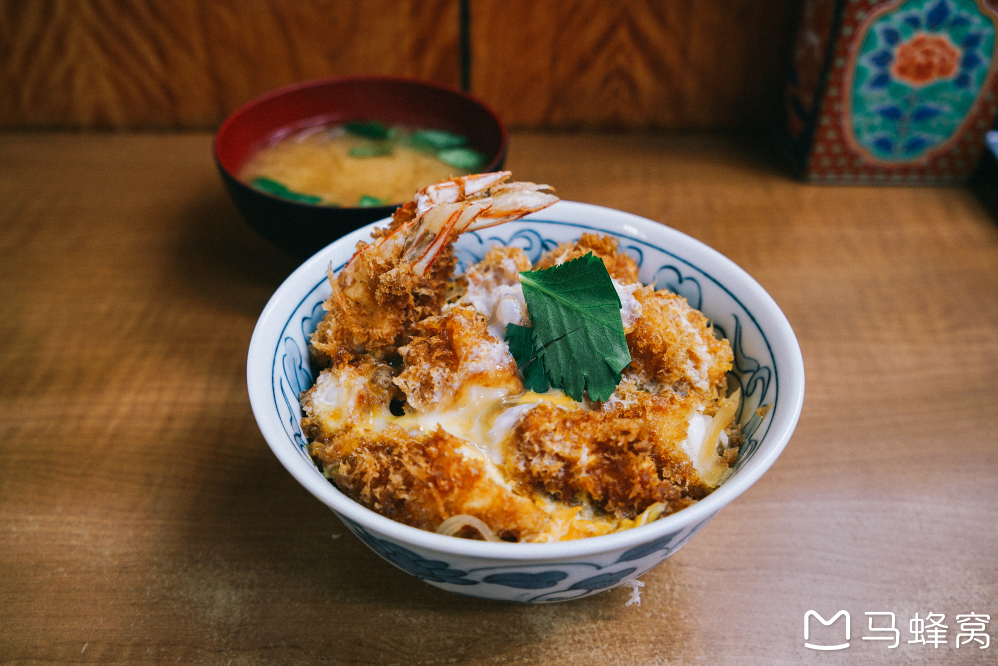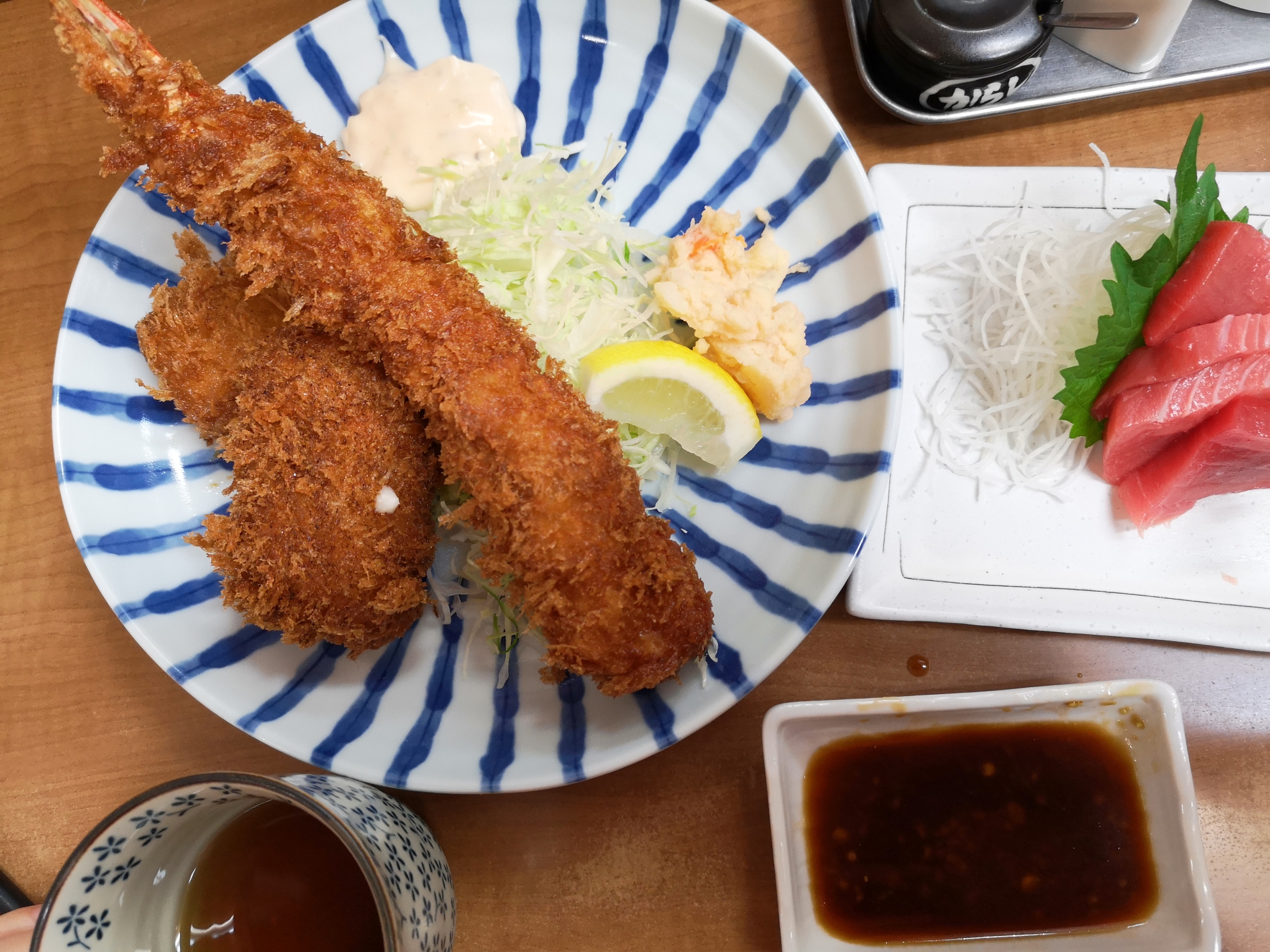 等了小一会,我的炸虾天妇罗盖饭上桌咯。与炸虾定食不一样,那个配的是美乃滋酱,定食的炸虾是裹在了半凝固的蛋液中,放在米饭上,最后淋了酱油。