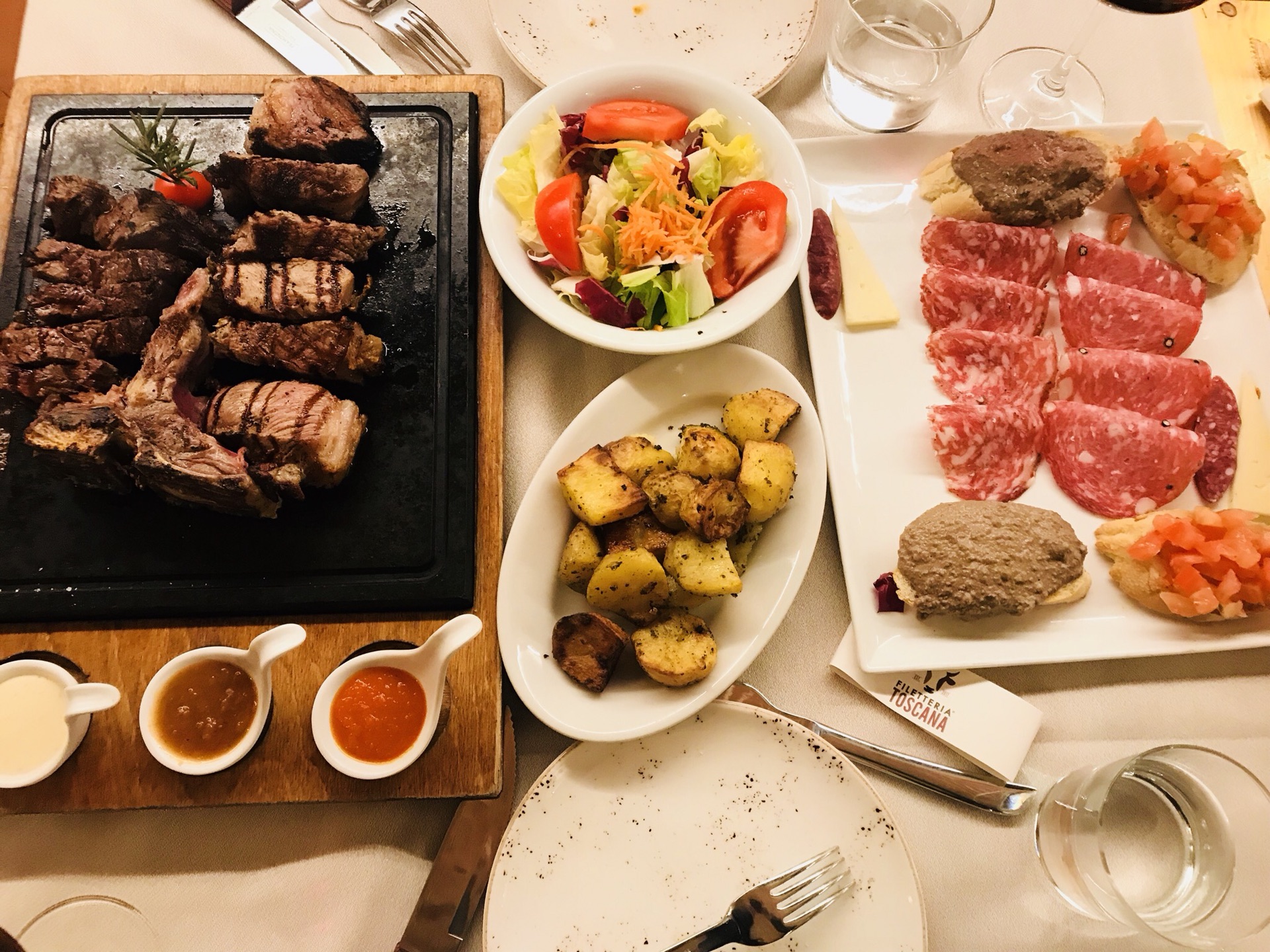 慕名而来的一家店,很方便。两个女生点一份佛罗伦萨T骨,直接要吃到肚皮爆掉。牛肉很香,吃下去超级满足。就是量多,无奈,别的便宜的牛排不是本地牛。两个女生,一份T骨、一份配菜,375升的餐酒。非常足够。值得一试