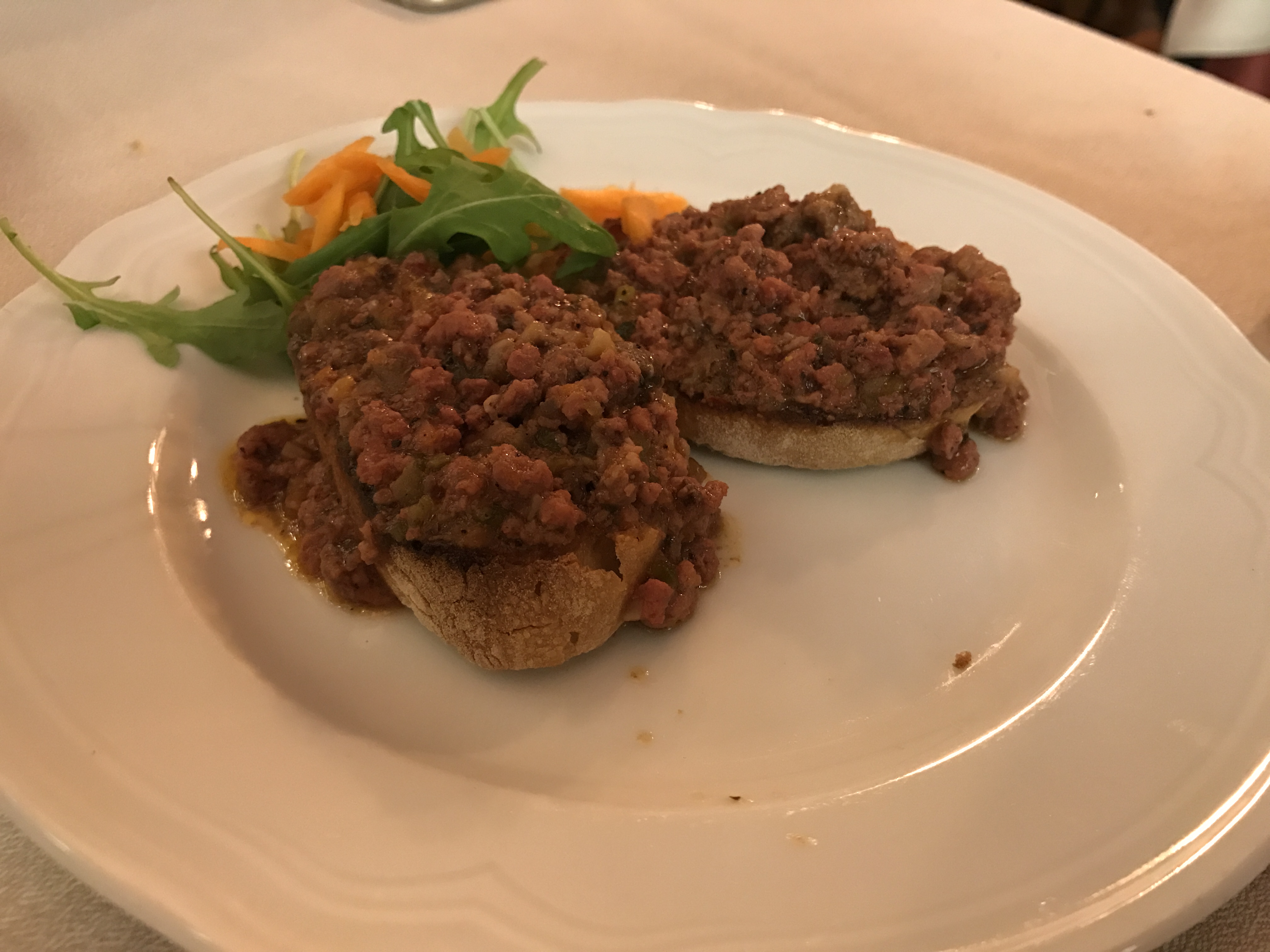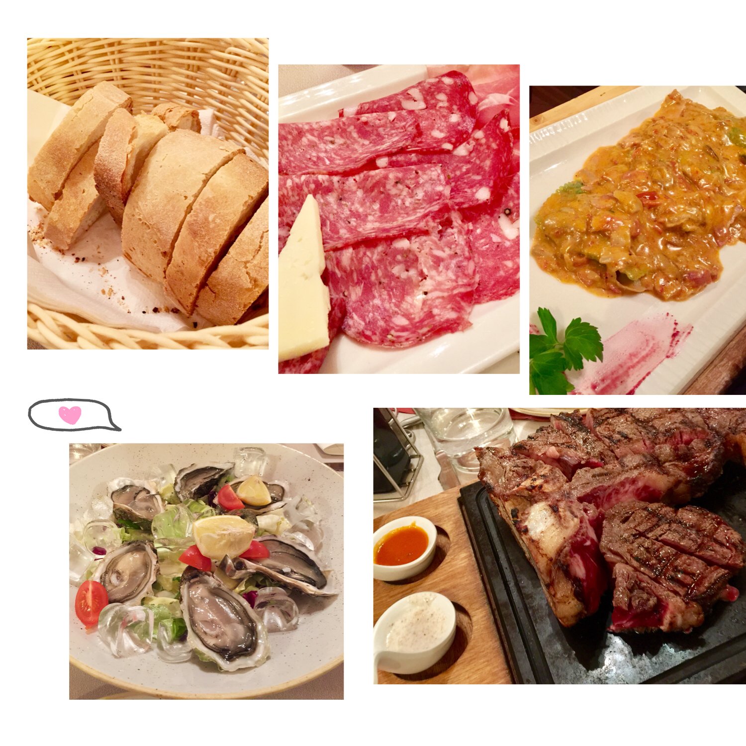 点了招牌菜T骨牛排,一份1.2公斤,55欧元。牛排烤得恰到好处,又嫩又香又鲜,还有Q弹,好吃到没朋友。同时点的生蚝、火腿亦很有水准, 意大利 饺子味道则一般,总计花费118欧元,其中Tasse E Coperto每人2.5欧元,我理解是台位费之类的,这顿牛排大餐还是物有所值的。