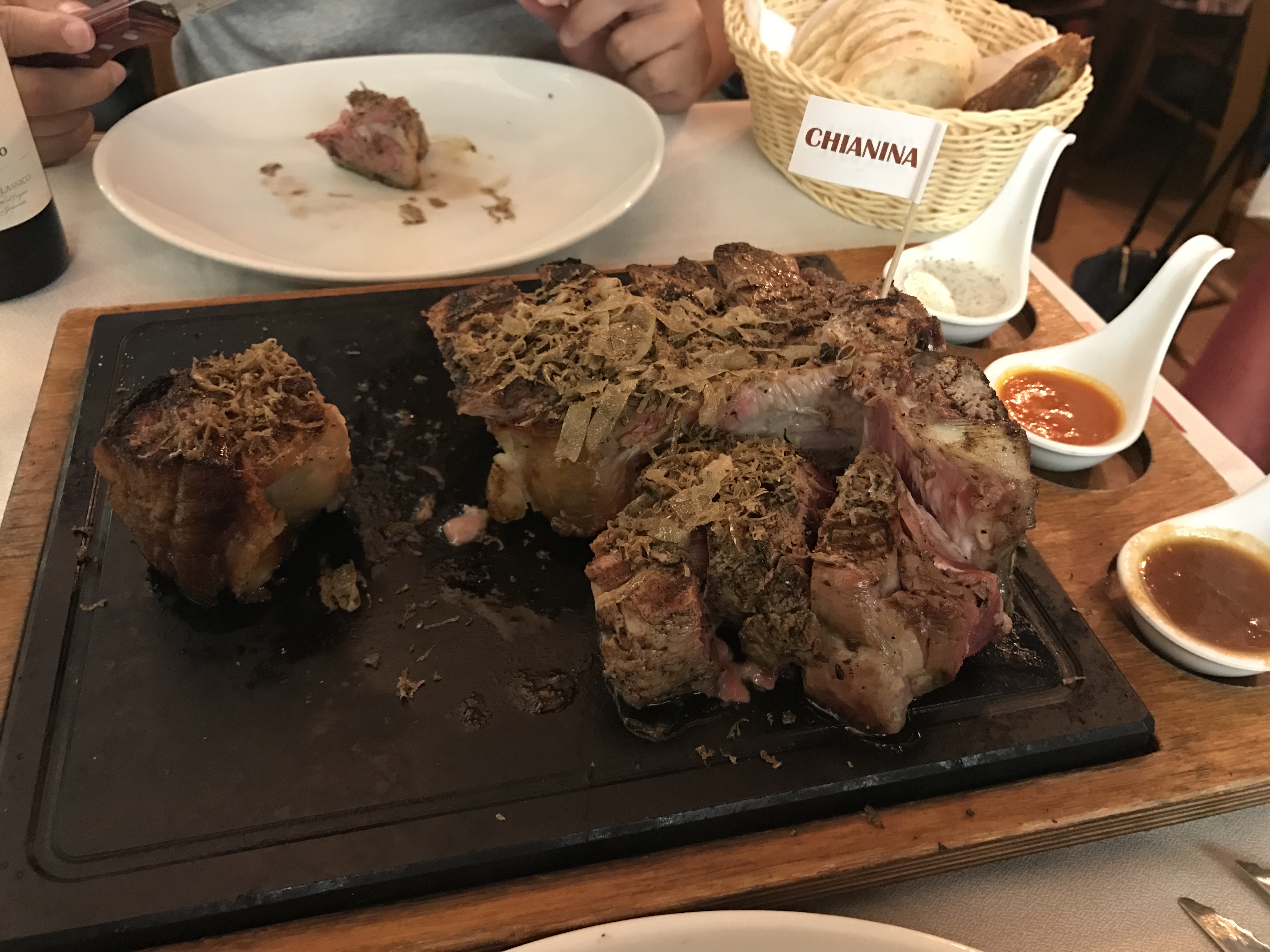 Chianineria - Trattoria dall'Oste离市政广场不远,走过路过时看到门口有牛头的模型、店堂里挂着大块肉排,里面很火的样子,进去一问正好有空位。其实这时店堂已坐得比较满了,客人好像大多数是 韩国 人,料想其在 韩国 是家网红店。