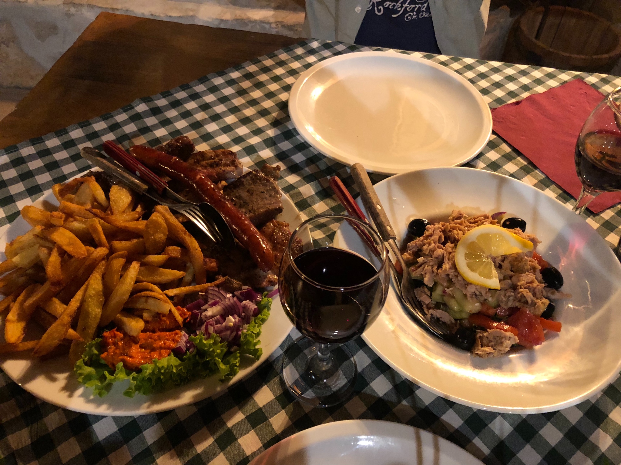 通过网络查到一家叫Dubrava的餐馆,烧烤排名第一,据说要预定什么,唯一的不方便就是远点,在Srd山上。一到那边吓一跳,荒村野店的,一位顾客都没有,还以为关门呢,迎宾小姐走出来说正常营业,我们才放心让的士走了。不过服务员说这里没办法叫的,附近有公交站,只能走段路,好吧,总有办法的,先吃了再说。本来想点传说中超好吃的羊排,不过答复是来不及了,这个要预订,转而点了烤肉拼盘,吃得也不错,但总感觉比家乡的撸串差了点。