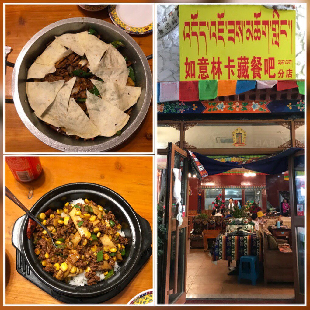 这是家网红餐厅。来个吉祥如意三人餐,牦牛肉盖饼、传统香菇烤糌粑、西藏拌饭、如意摸摸,都是第一次吃,都好吃。老板还给献了哈达,也很热情。