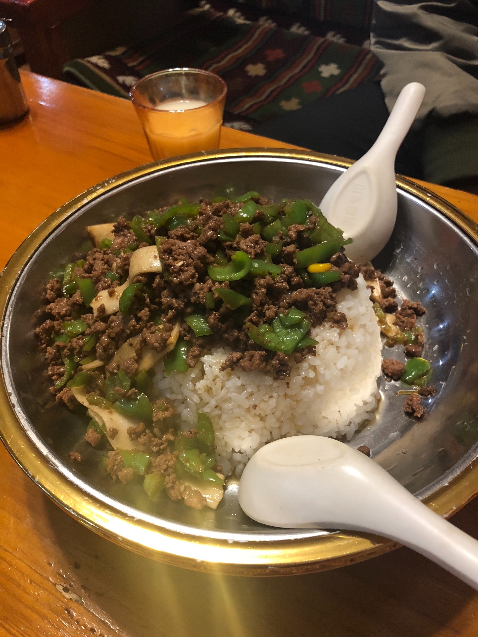 听说甜茶能缓解高反,连忙点了一壶,但店员本地藏族人说酥油茶才能缓解高反,而且他们都不喝甜茶只喝酥油茶,于是一样点了一壶,酥油茶很香,口味偏咸,内地人一般喝不习惯,甜茶的口味不敢恭维,有点像内地卖的奶茶。点了牦牛肉,偏硬,肉质紧实,两人点一盘牛肉分量大到根本吃不完。没有点牦牛肉火锅是因为西藏气候干燥怕上火。
