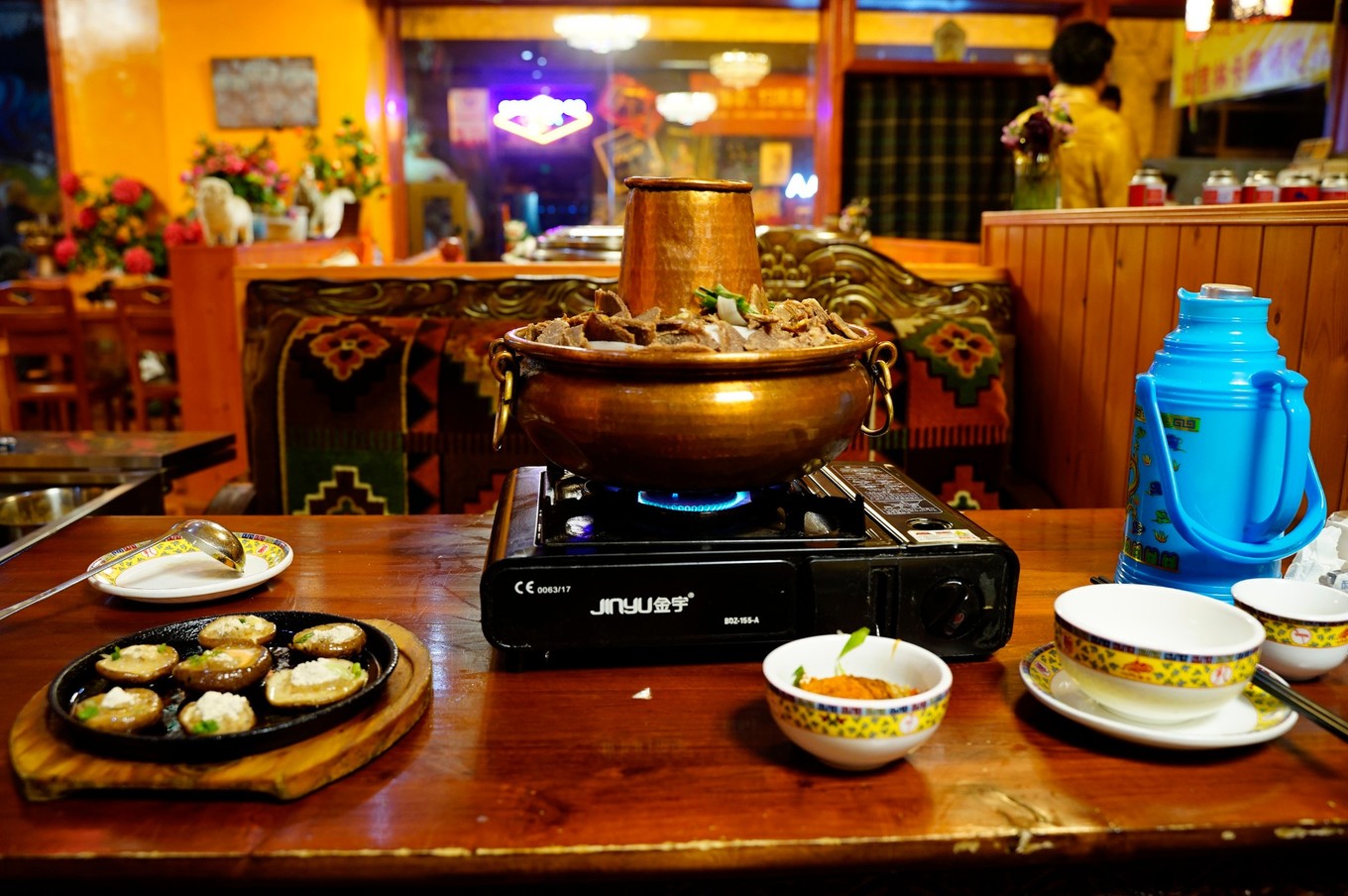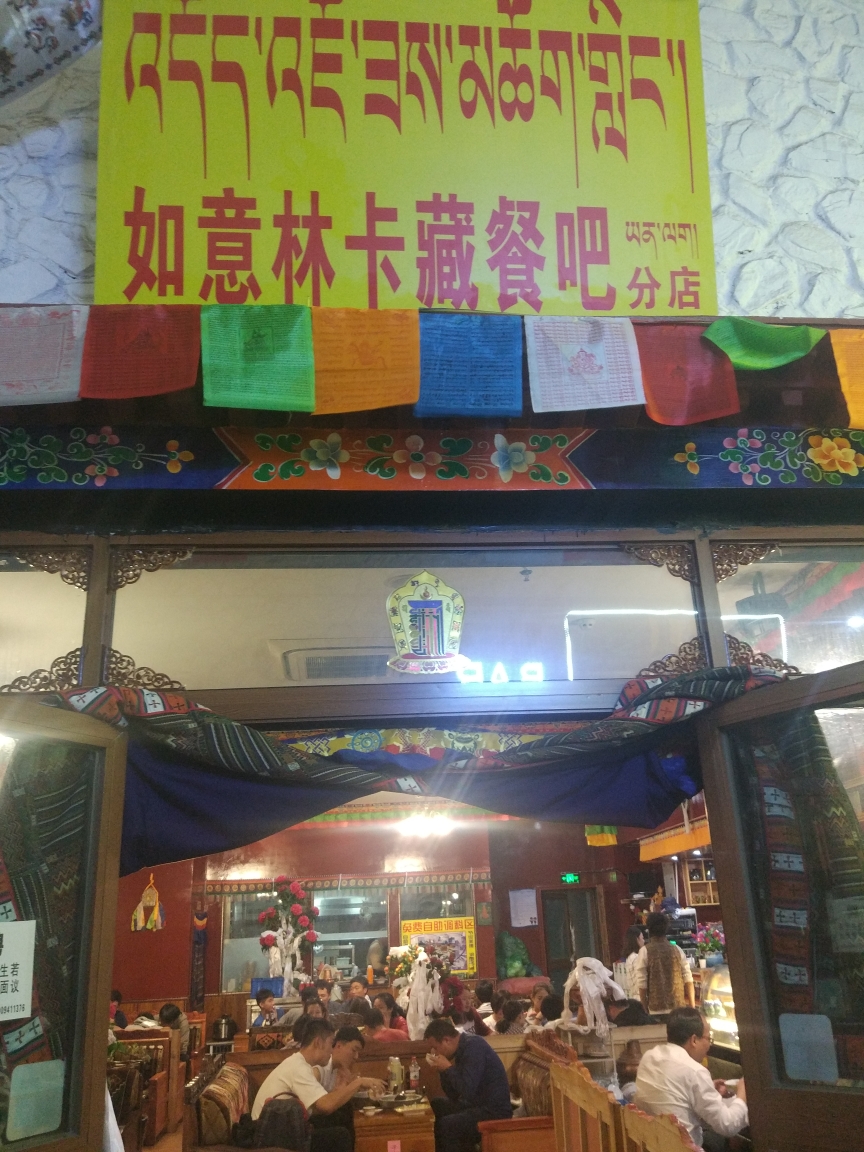 某天晚上我决定要去一个人吃一顿牦牛肉火锅,于是在大众点评上对比了3家店后最终选择了 如意林卡。这家店位于林廓东路上的八廓美食街内,我去时候还早店内似乎没什么人。入座后点完餐后一位貌似是大堂经理的小伙子会热情地给你献上哈达。