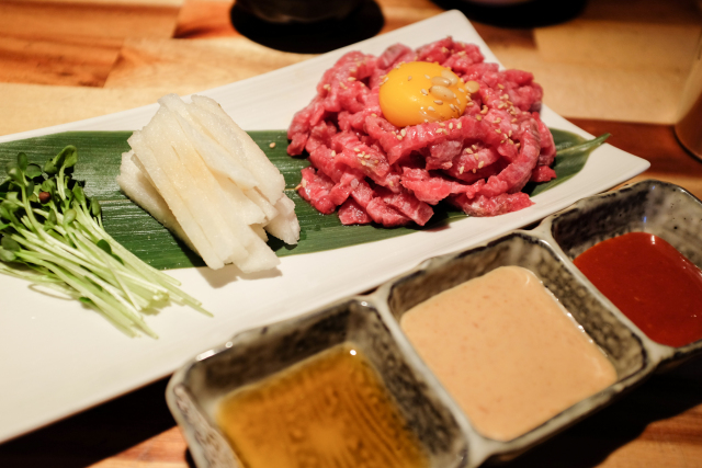 还没尝试过生牛肉又很想尝试的朋友,非常推荐这家的生拌牛肉了,非常有牛肉味配上雪梨和豆苗很提鲜呢,餐厅还提供香油、芝麻酱和甜辣酱给客人选择,本人口味推荐香油和甜辣酱,香油提香不夺味而甜辣酱能体验一番韩国口味,诚荐大家吃吃
