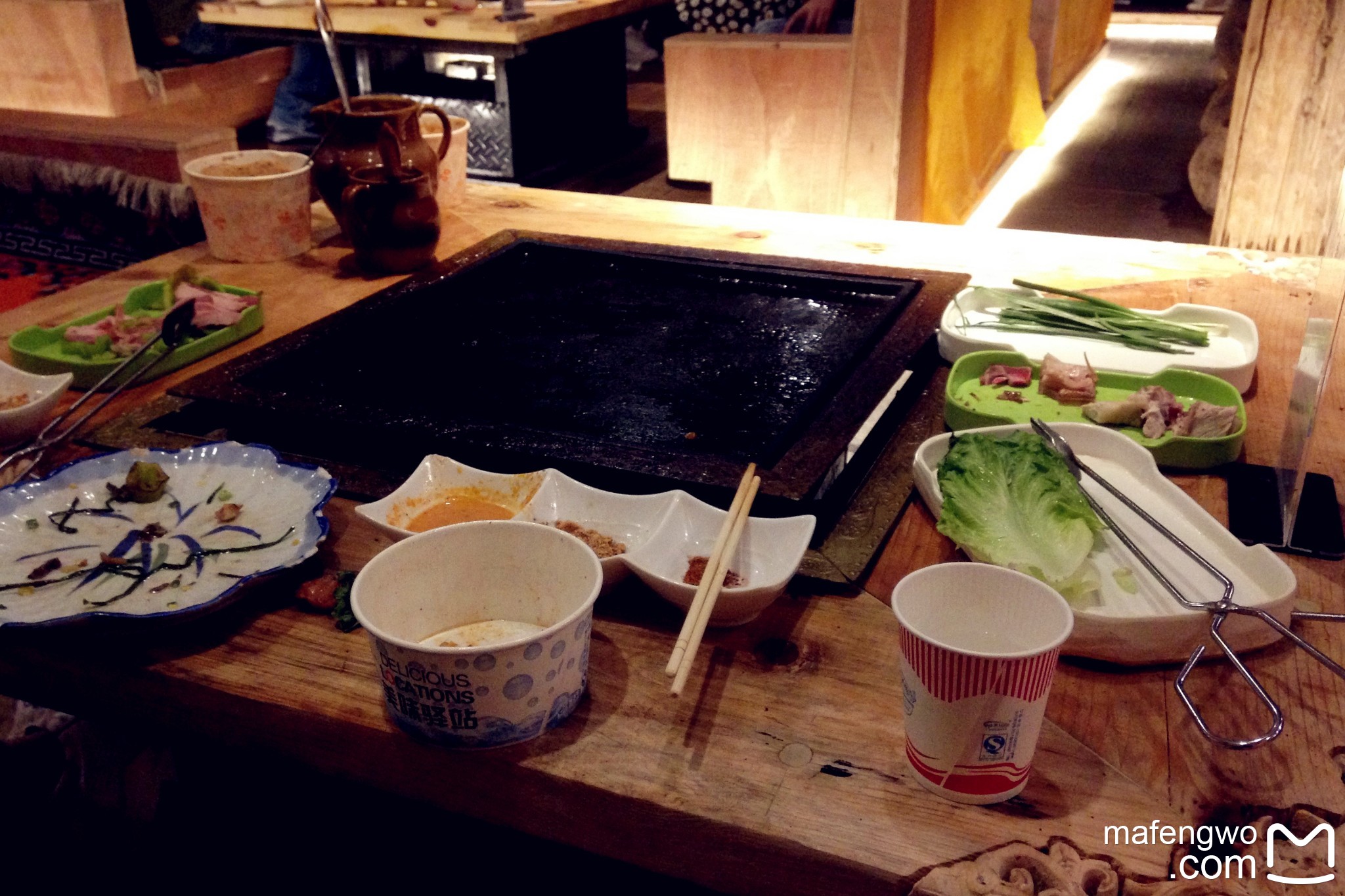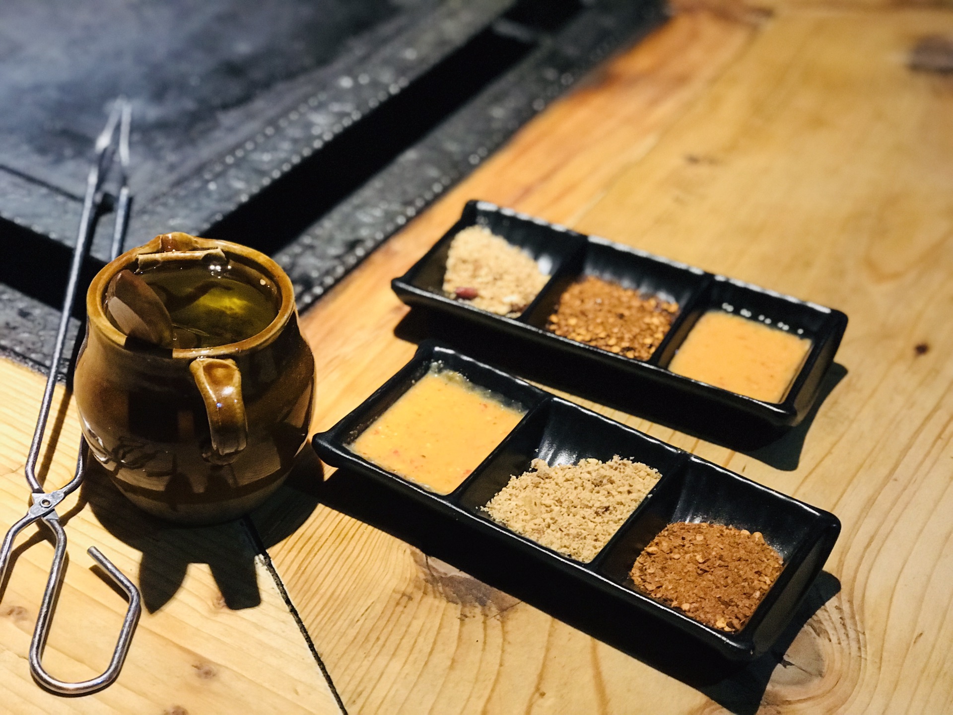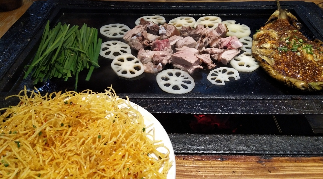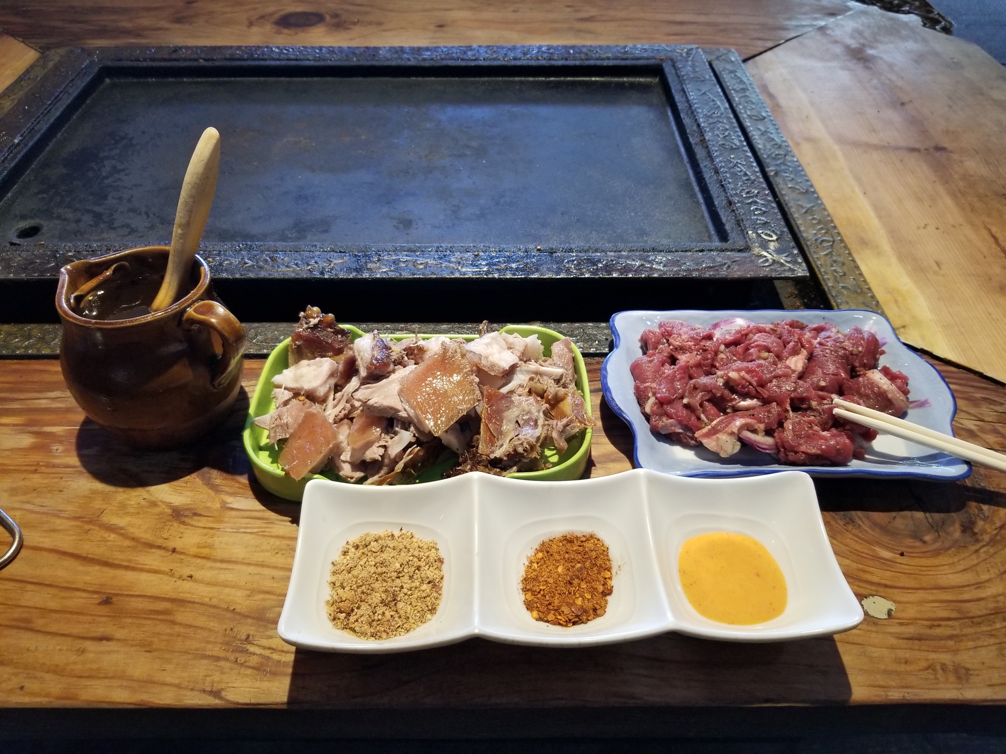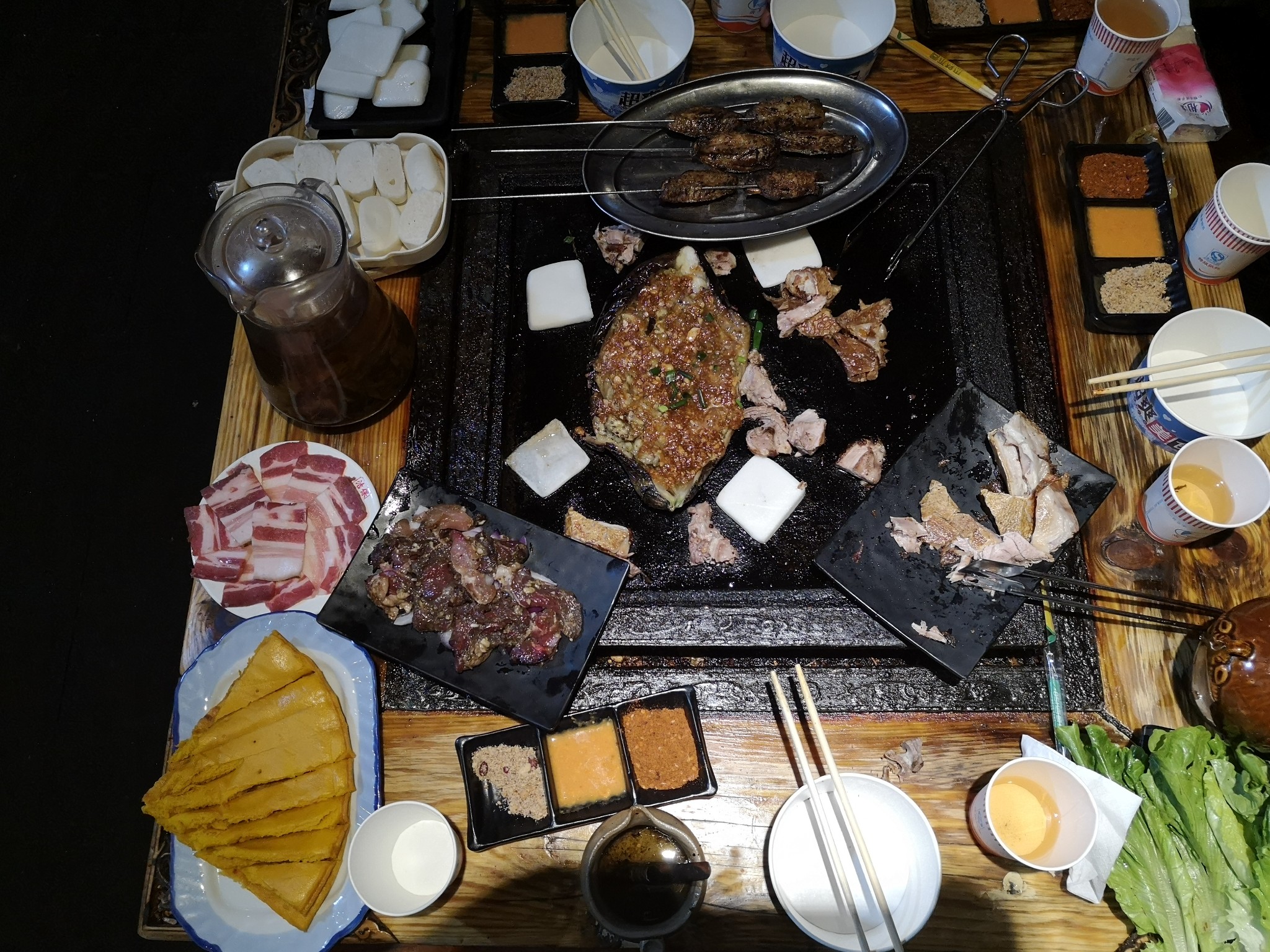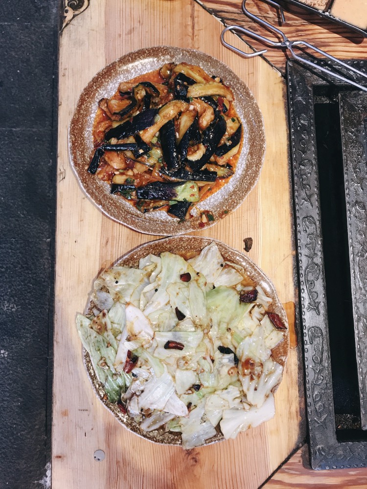 走进去发现里面还挺多人的,感觉里格大半的游客都在里面了,街上真的没几个人。铁板非常大,一张桌子至少可以坐8个人。我们两个人面对面坐下时忍不住惊叹吃个饭这隔得太远了吧哈哈哈哈。羊肉串真的很好吃,其他就呃呃呃呃......而且不幸的是,两人回去都肚子不舒服了......
