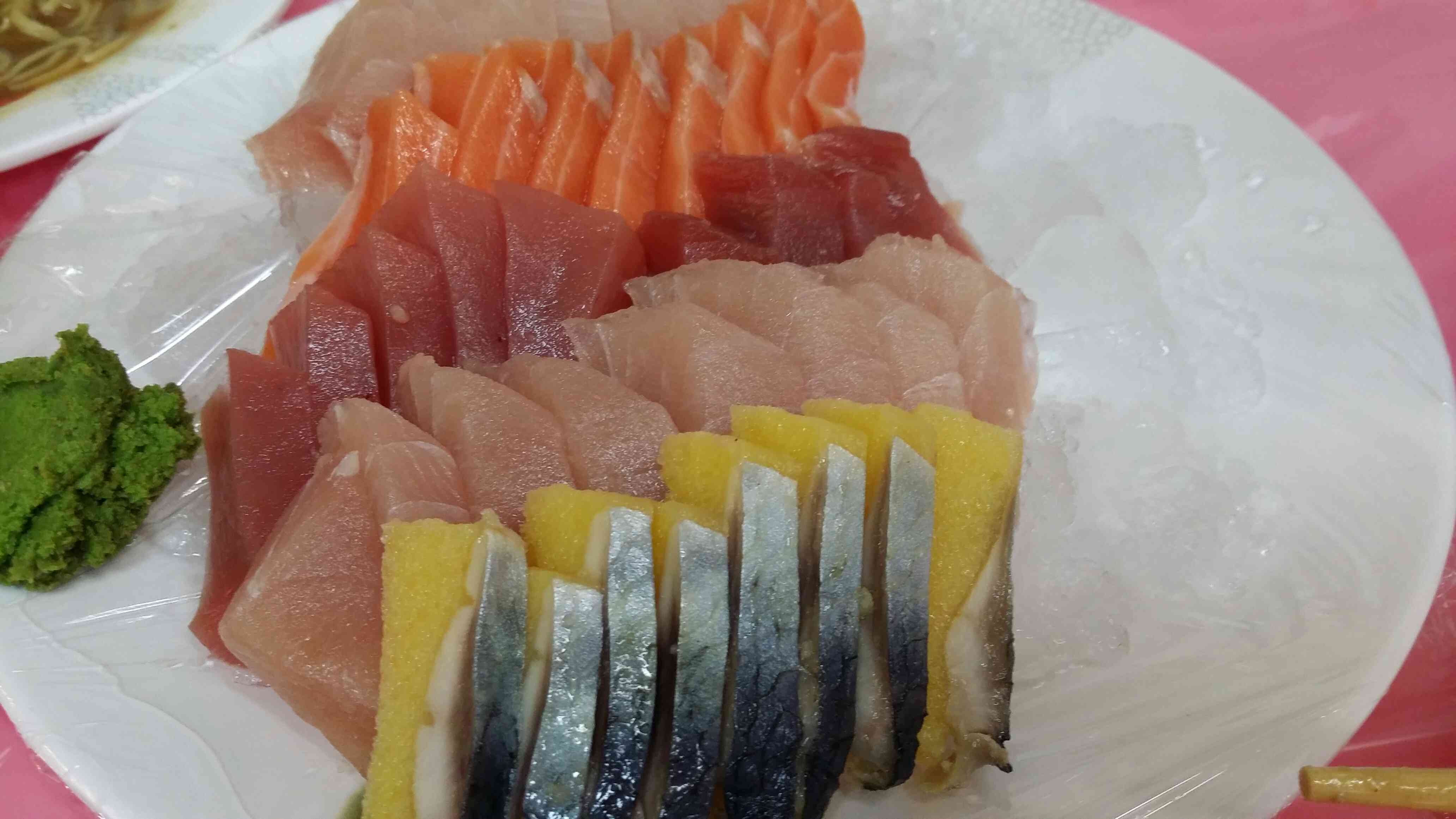 这边的海鲜炒鸡新鲜哟,物价来说比较平民百姓,生鱼片一盘这么大才100新台币啊,有木有心动,不过对于生鱼片来说我不能多吃,吃到第四块是硬着头皮吃下去的