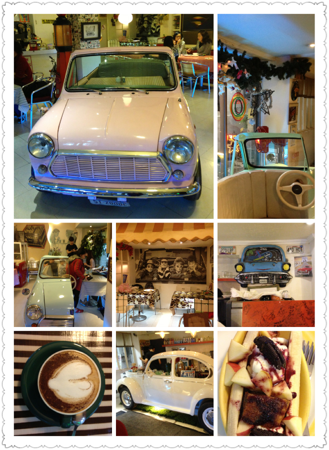 这家店有四两古董车,我最爱那个粉色的mini!老板从美国花重金购置这四辆车,把他们锯开给客人当座椅。我们因为去之前没有预定,不能坐在车里面,只能在外边的餐桌上用餐。店内的装饰很朋克又不失温暖,墙上有一排都是牌照,很有意思。我们点了咖啡还有什锦水果香蕉船,据说香蕉船是他们的特色之一。