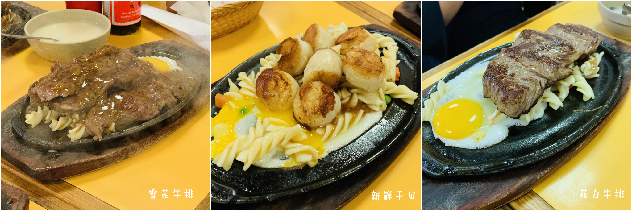 菲力、雪花牛排和干贝的美式套餐组合,面包+汤+主食,非常的饱!牛排也是比较美式的风格,菲力稍微有点老,雪花牛排很嫩,不愧是当家花旦。但是我们的意外之喜是铁板干贝!铁板烤的干贝真的很不一样,微焦的香味和口感,反正我觉得比一般烤扇贝美味太多个LEVEL了,这家在士林也有分店,裂墙推荐!我要推荐他C位出道!绝对五~!