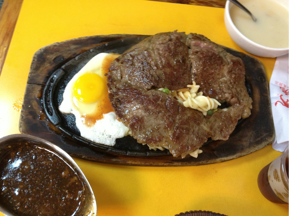 出捷运老街入口第一家,点牛排套餐,饮料自助随便喝。套餐内的玉米糊,味道很不错。饮料自助随便喝,其他碳酸饮料哪都能喝,冰镇红茶真的说不出的好喝。推荐!牛排真的很大!T骨盘子都装不下了!胃口小的人建议2人吃一份,或者3人吃两份!邻桌好些人都吃不完!牛排味道倒是中规中矩。