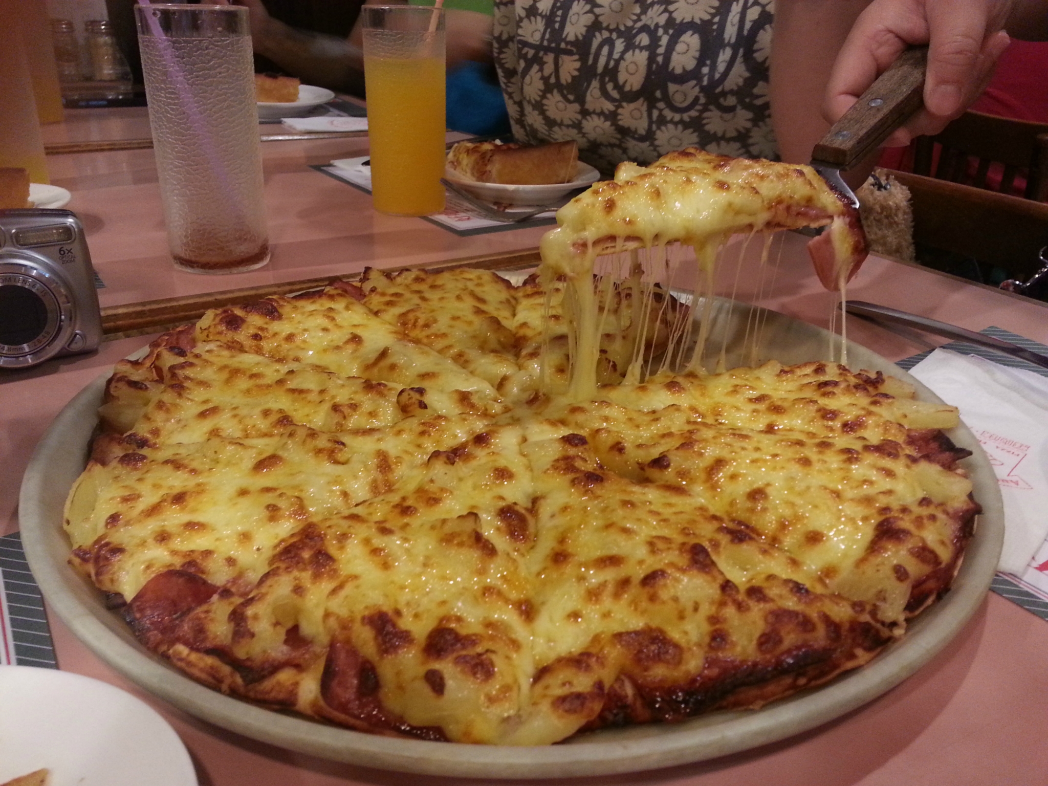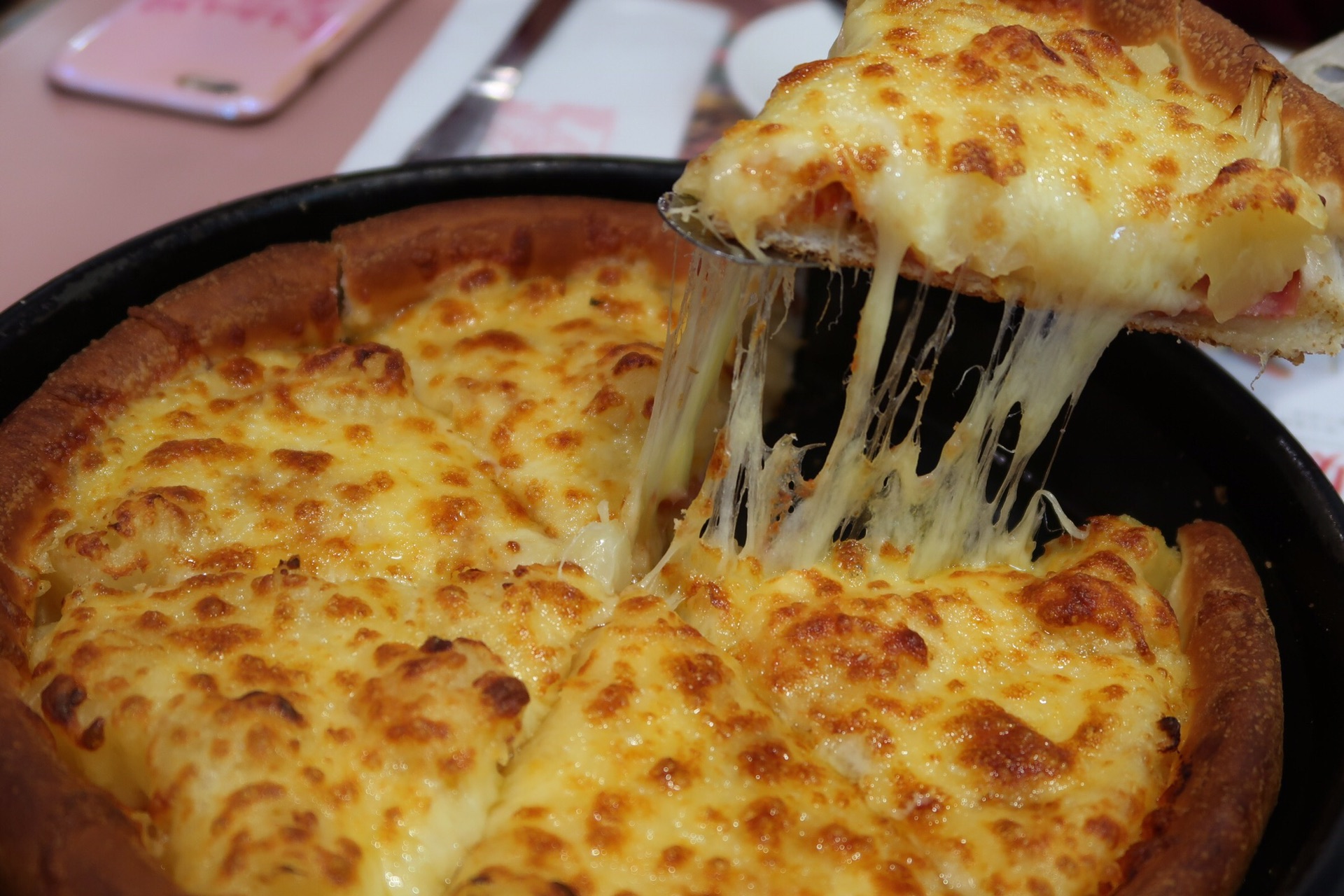 刚出炉的披萨饼底是真的!很!松!厚!芝士厚厚地布满表面 拉丝的感觉超爽!