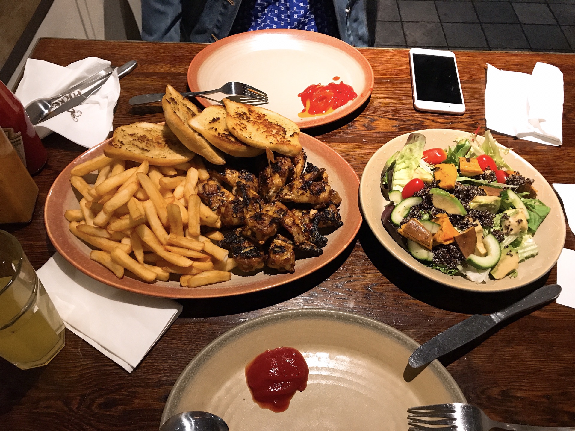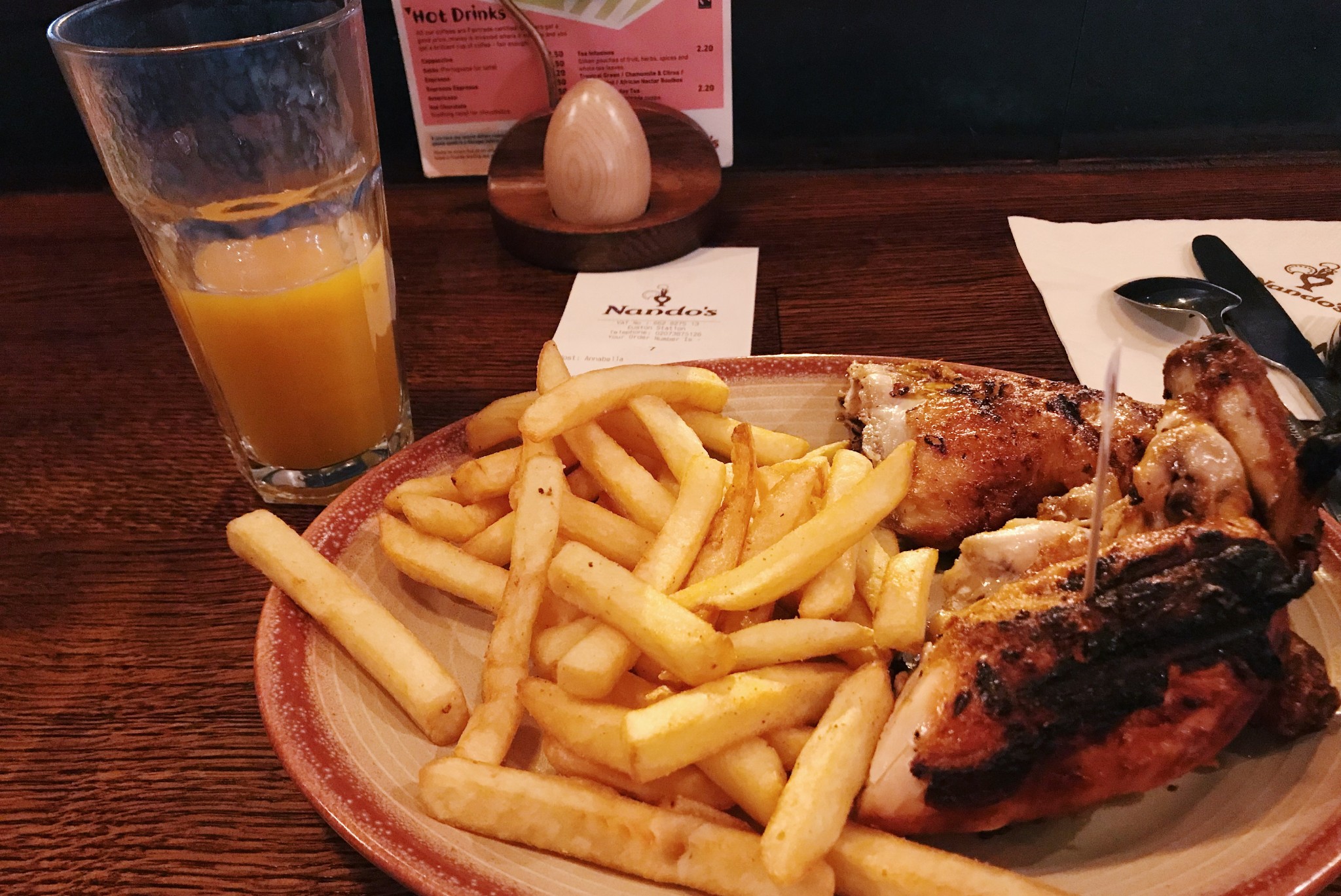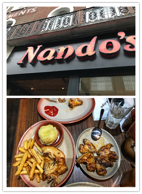 就近找了一家网红餐厅Nando’s吃了烤鸡,文盲一般的点菜,真是this、this and this,反正喂饱了自己的肚皮,赶回酒店。葡萄牙烤鸡,其实味道还不错,价格也不贵。