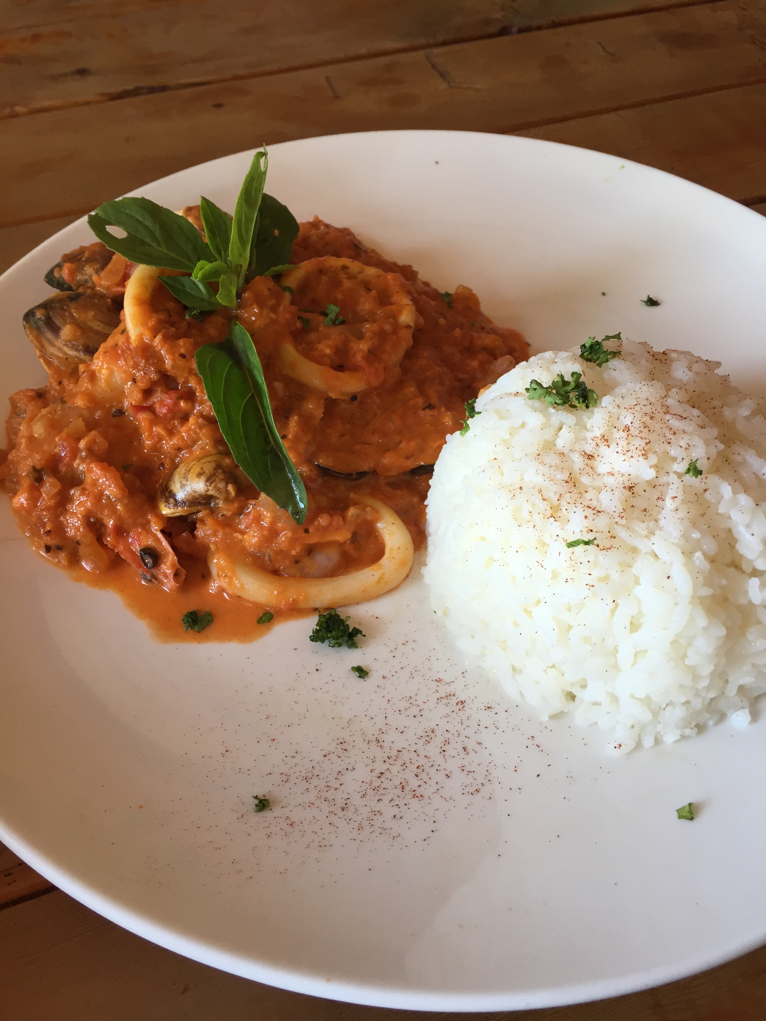 老板是法国人,热爱料理,台湾妻子拿手开胃台菜和泰国菜!老板娘人很好,不知道点什么的话,可以让她推荐~位置:屏东县恒春镇南湾路220号(南湾停车场对面)吃过的料理中 推荐 咸蛋黄金豆腐,西班牙海鲜烩饭,滑蛋牛肉,海鲜红咖喱和松露芝士蘑菇意面。甜品也都是自己做的,可以尝尝看~ 去的那天晚餐是17:30开始营业的。