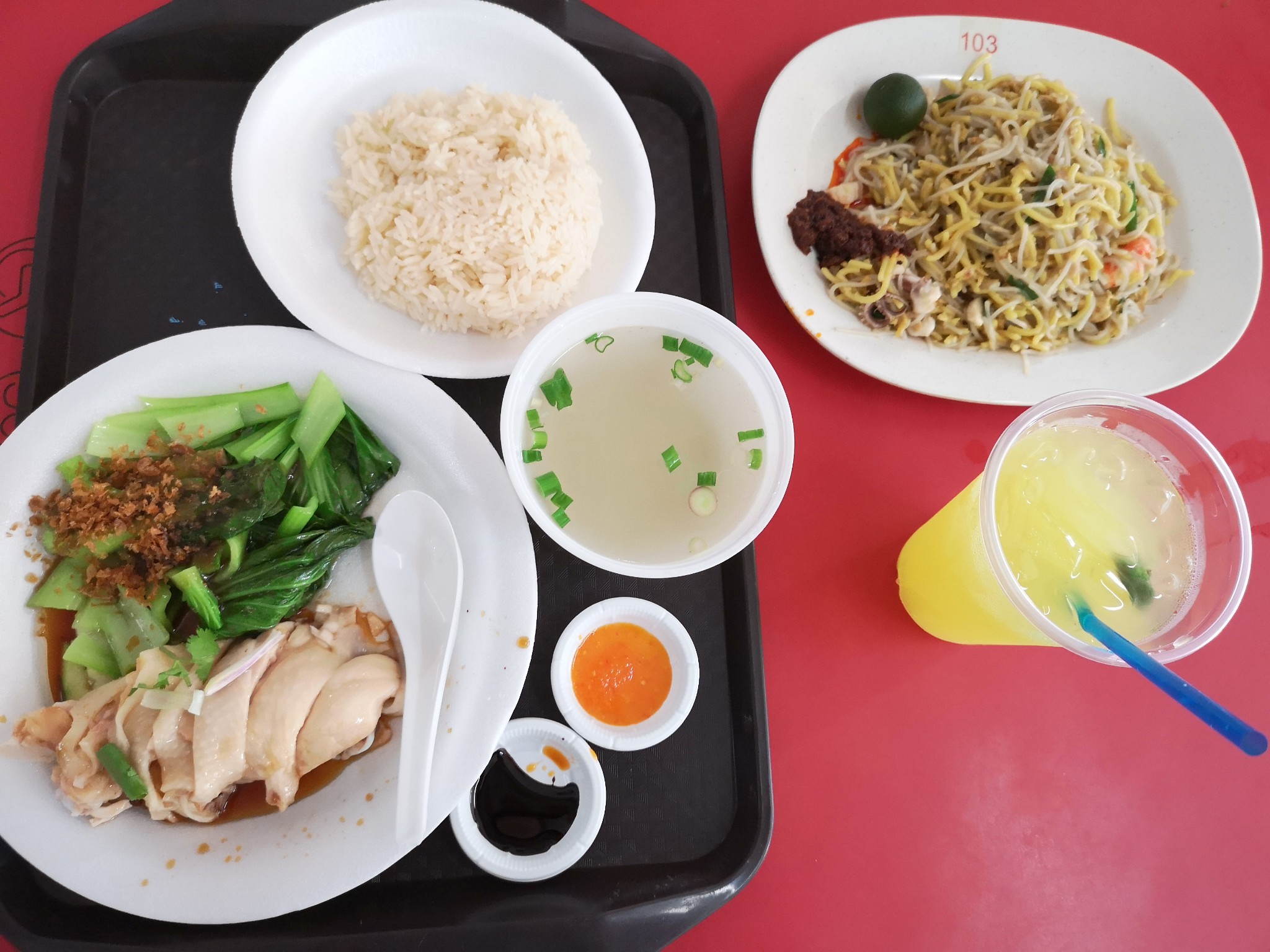 牛车水大厦二楼的 熟食中心,上楼梯后你会觉得崩溃呀。吃什么好呢。跟着攻略,跟着人流涌动,我选了炒粿条(全能俏妈妈 02#103铺位),一聊天居然是福建来的两位大叔,很热情地让我拍视频,现炒现卖,非常好吃呀,竟然感动滴以为回到了厦门呢。在大叔推荐下,选了对面的海南鸡饭,果然饭煮的不错呢,单点真的是3元。但是我选了鸡腿,加上青菜。另外还买了咸拧水。共花费10.5 SGD。真心比后面天天海南鸡饭套餐7.4SGD的物美价廉许多呢。