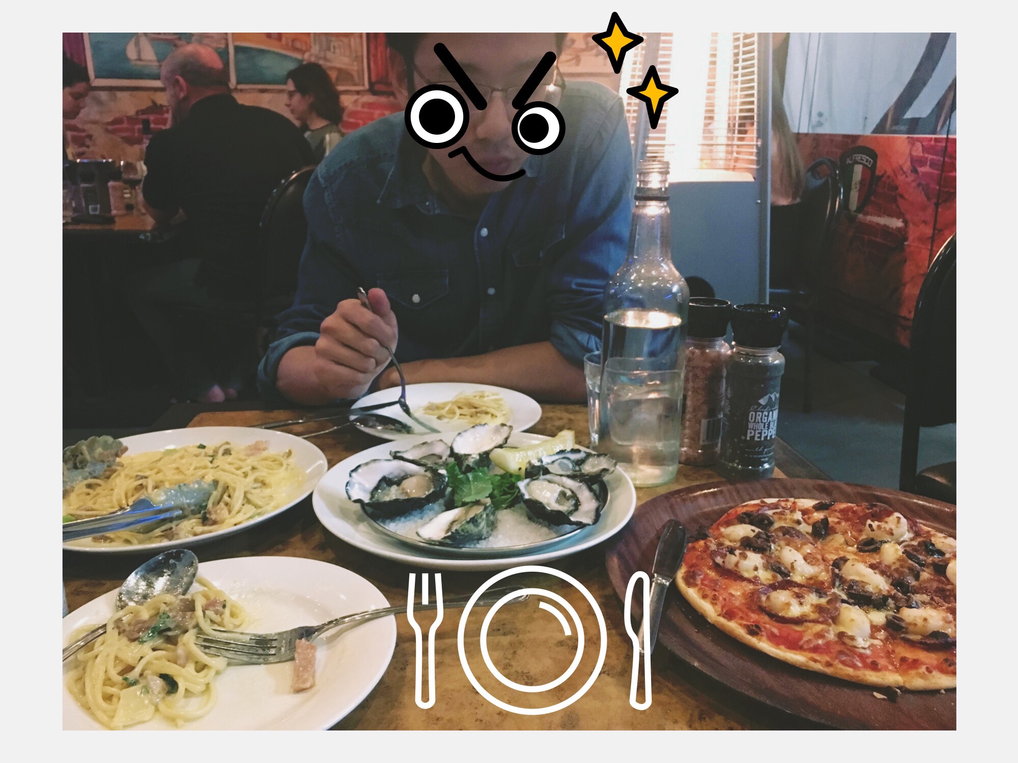 在猫途鹰上看到排名靠前就摸索过去,听说是一家米其林餐厅!很多老外来吃这家意大利餐厅,店里提供英文中文日文韩文菜单真是很贴心,店家态度也很好!到了饭点生意很好,对于我这种选择障碍的人来说在这家点单真的是很纠结,披萨、意面、酱料连生蚝的做法都有好多种选择==我们点了一个薄皮的披萨,半打原味的生蚝,一个奶油蘑菇酱的意面,总体很满意,生蚝鲜美,连我这种不要吃生的生蚝的人都吃了两个。晚上正好遇到斜对面的一桌有一个小朋友生日,餐厅店长送上了生日蛋糕,然后生日歌响起,全场都在唱生日歌,还挺有意思的。