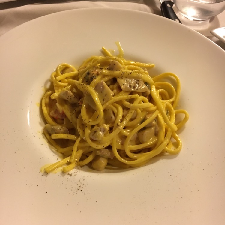 这是一家口碑也很不错的当地餐馆,需要预订(预订邮箱info@nerinodieci.it,官网在此http://www.nerinodieci.it/index.htm),午餐12:30-14:30,晚餐19:30-23:00,周六午餐和周日全天不营业,我们预订了晚上8点的时间。到点进店,环境、服务都很不错,苏苏点了一份羊排,我看似西红柿鸡蛋炒面的spaghetti,其实是奶酪,服务员会一层一层地把奶酪和面混合,再一点一点地盛出来。