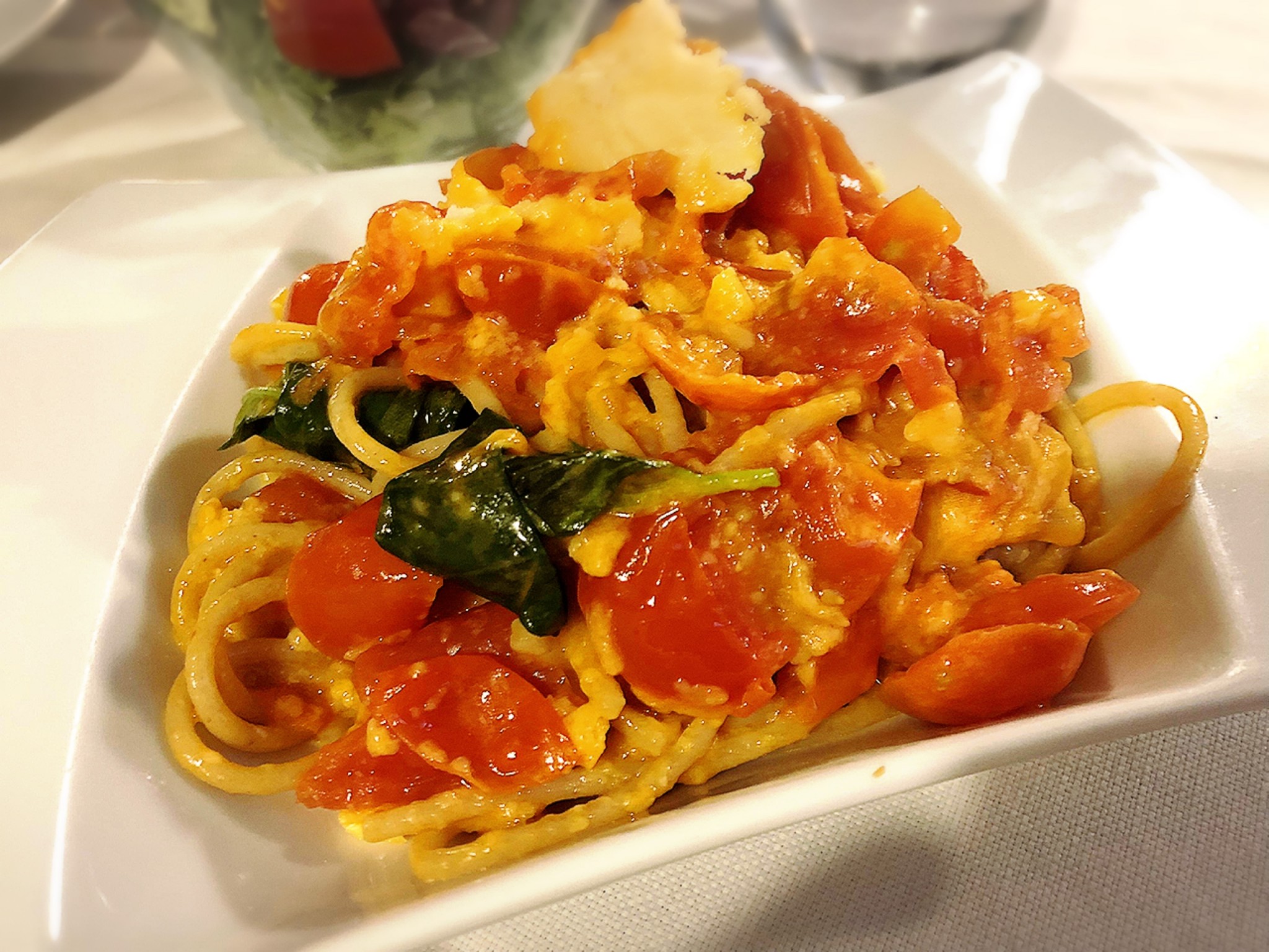 到点进店,环境、服务都很不错,苏苏点了一份羊排,我看似西红柿鸡蛋炒面的spaghetti,其实是奶酪,服务员会一层一层地把奶酪和面混合,再一点一点地盛出来。