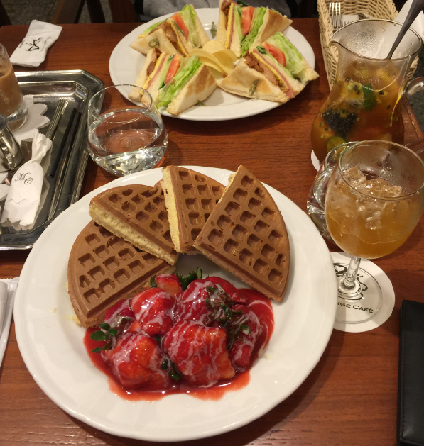 大约等了15分钟,就被米朗琪安排到了2店,点完餐上菜超快,招牌草莓奶油松饼一面酥脆一面绵软,配上草莓和卡仕达酱OMG也太香甜了吧。冰水果茶百香果的味道很浓,太大一杯,喝不完打包。老公不爱吃甜食,点了冰滴咖啡和总汇三明治,据说咖啡是偏酸的,但是品质很好,三明治太大块,咬不下嘴。