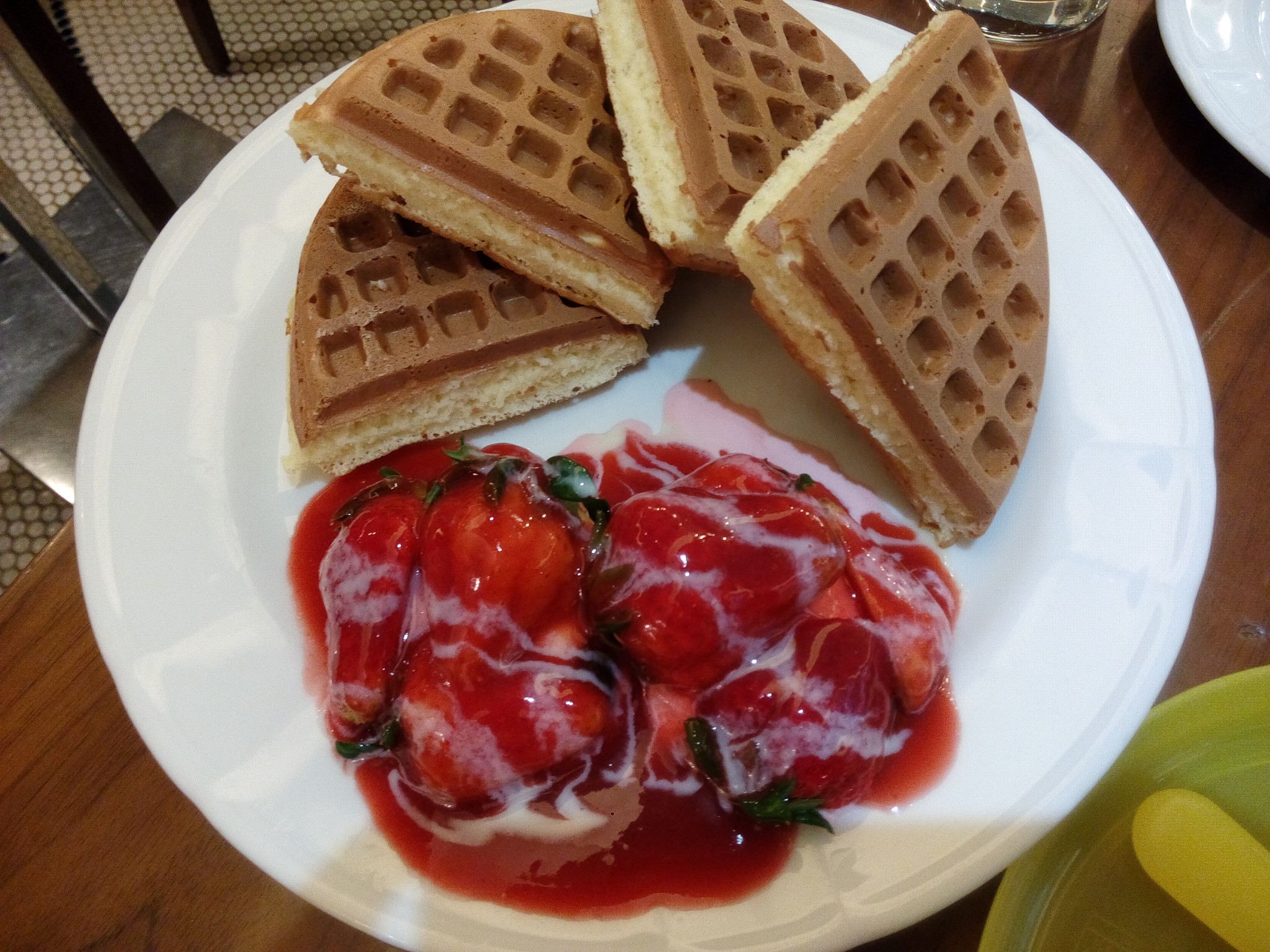 咖啡拉花很漂亮,糖是放在一个小篮子里,各种种类可选,草莓松饼,货真价实的原粒草莓,儿子吃饭磨磨蹭蹭,吃起松饼来毫不含糊,要是吃饭也有这个劲头我们可就放心了