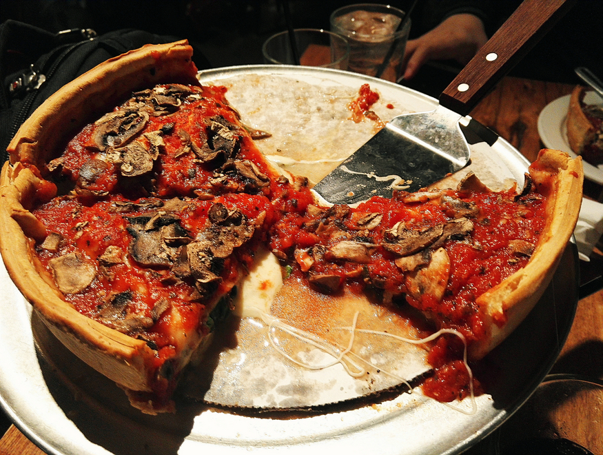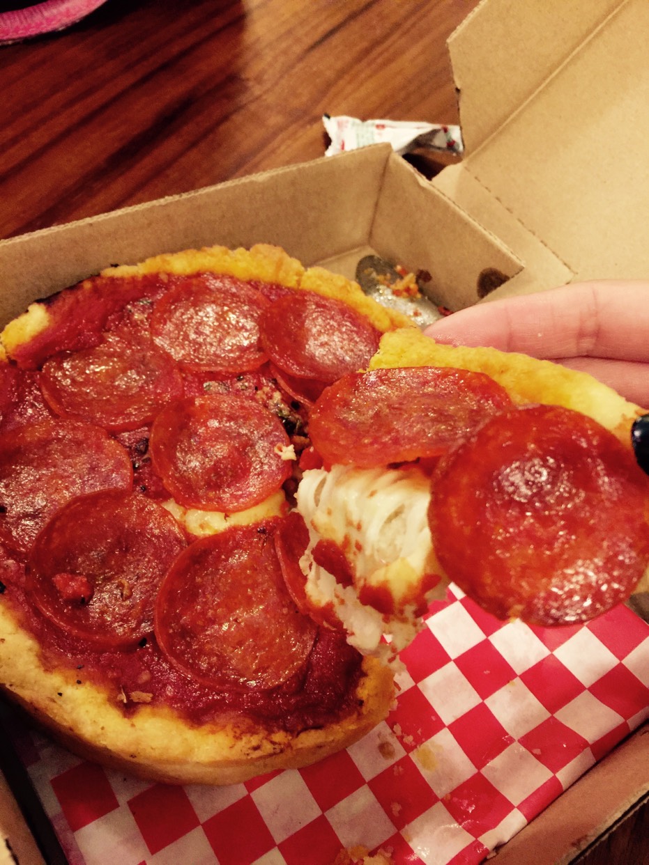 有名的芝加哥深盘pizza啊!必去啊!我这个不爱吃pizza的人吃这个都很开心呢!比一般的厚很多很多!就在威利斯大厦附近