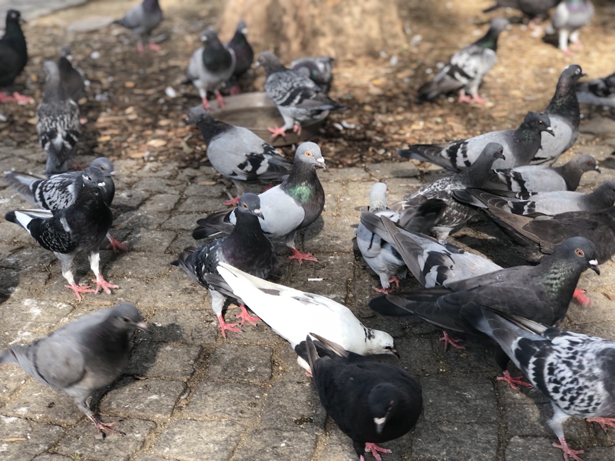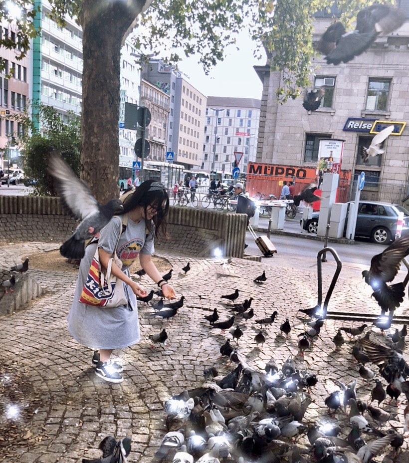 法兰的中央火车站旁边还有个坪有超级多的 你只要准备一点薯片或者面包它们都会蜂拥而来 这是我让路人帮我拍的照片法兰 他们人真的好好呀❤️