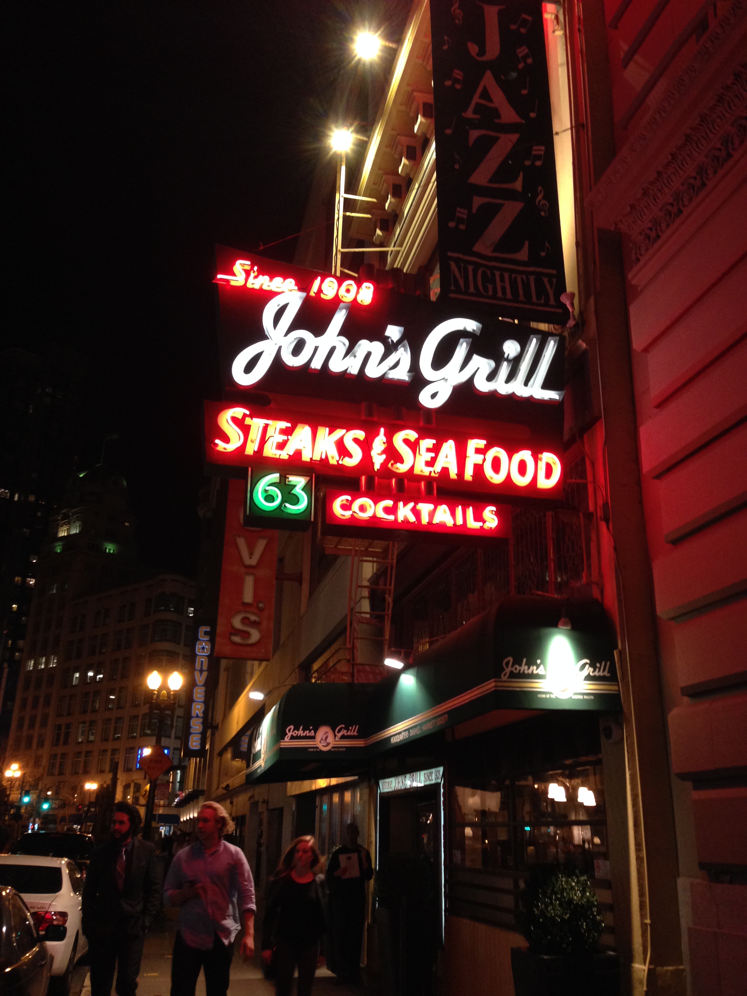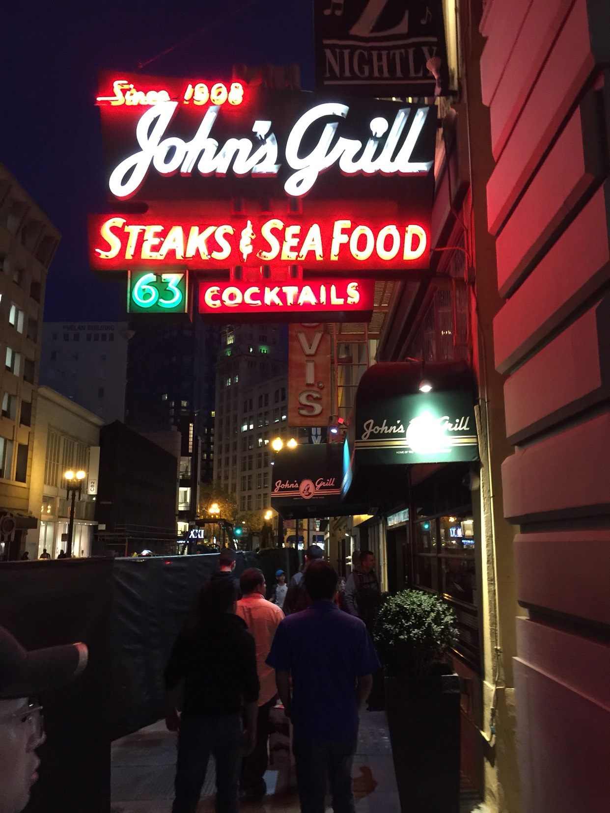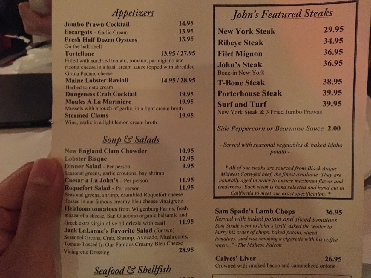 看上去很地道的一家美式牛扒馆,我们人多坐在3楼,都是大圆桌,一开始人少环境很好,后来坐满了人,老外吃饭说话也很大声的...喜欢吃瘦肉,点了New York Steak,朋友推荐medium-rare,可以接受,不爱生肉的我觉得再熟一分也许更好吧~配菜要的薯条,太好吃了,切的比较粗,外面很脆里面跟土豆泥似的,不知道怎么做到的。生蚝不推荐,没有渔人码头的新鲜。蟹肉推荐,配调料味道很好。虽然菜本身不贵,不过加上旧金山的税和小费,价格也不算便宜。