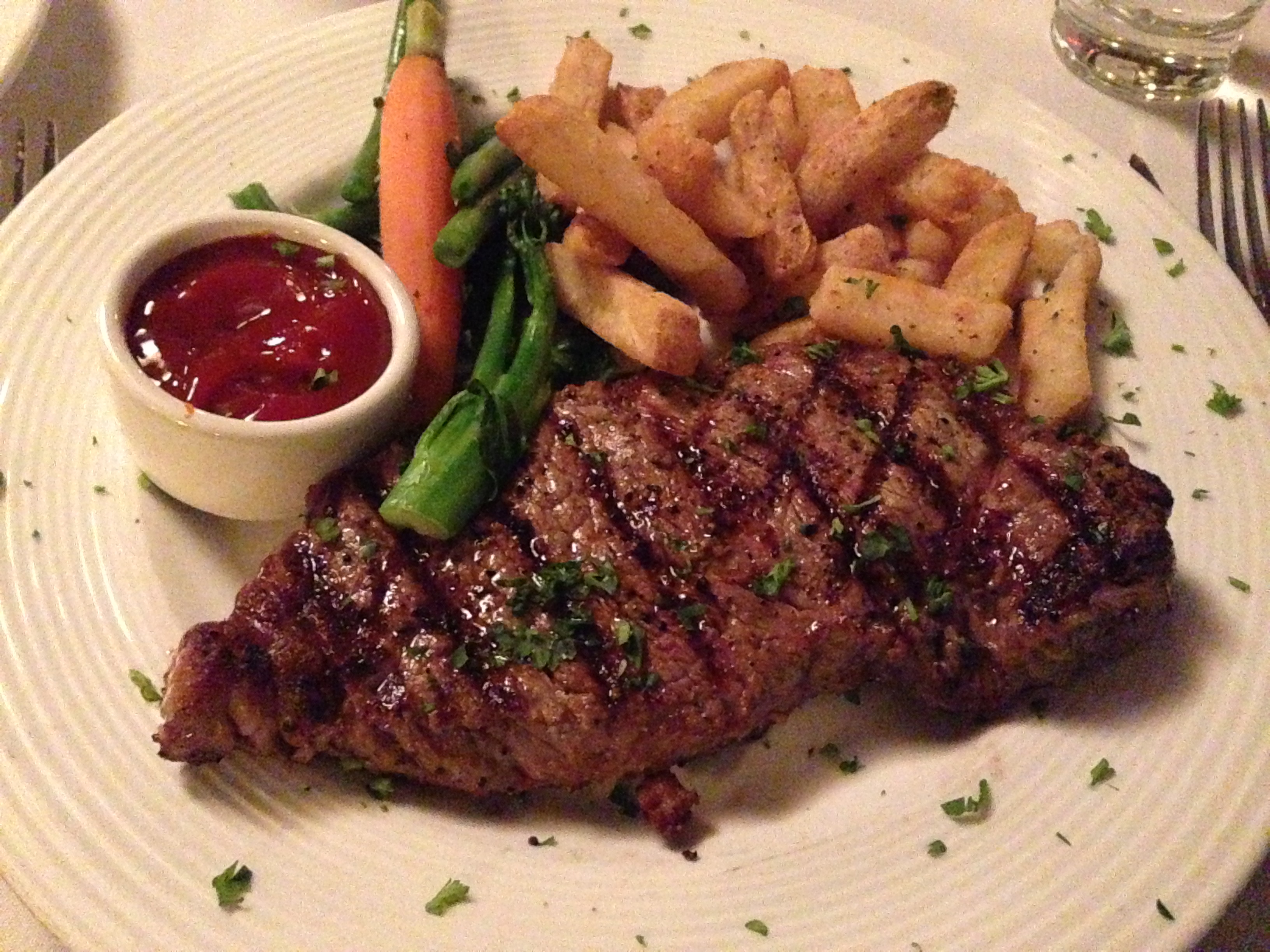 喜欢吃瘦肉,点了New York Steak,朋友推荐medium-rare,可以接受,不爱生肉的我觉得再熟一分也许更好吧~配菜要的薯条,太好吃了,切的比较粗,外面很脆里面跟土豆泥似的,不知道怎么做到的。