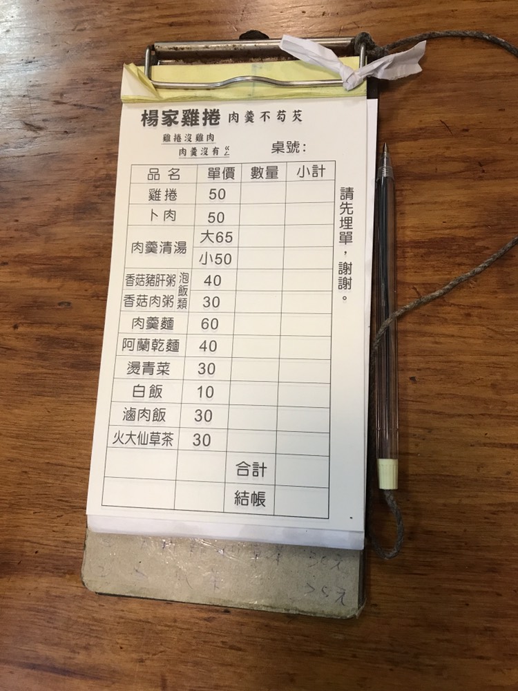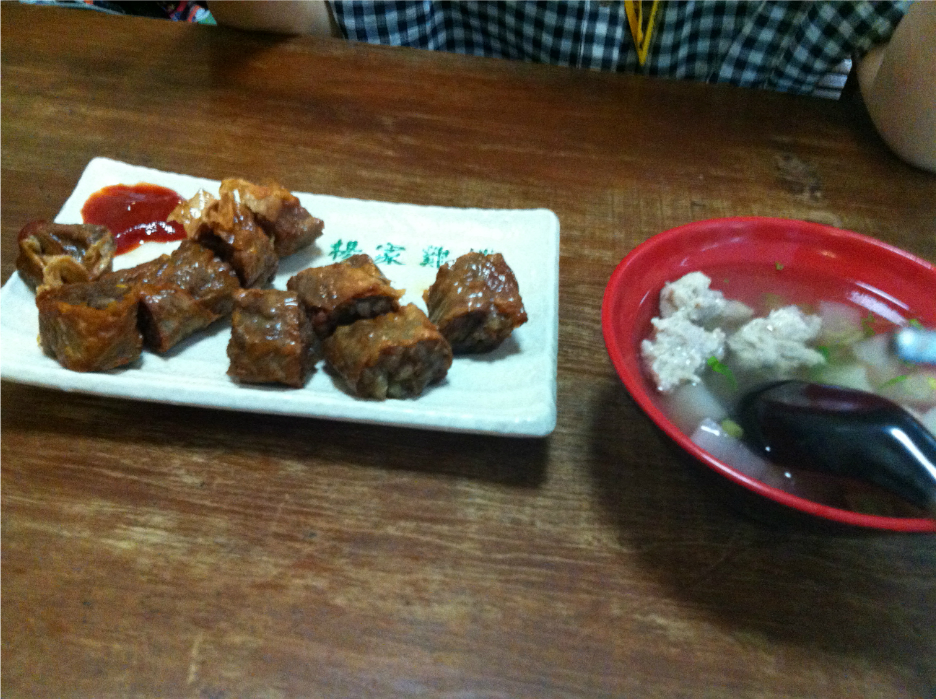 这家店很有意思,鸡卷没有鸡,肉羹不勾芡。点了鸡卷,50台币一份。