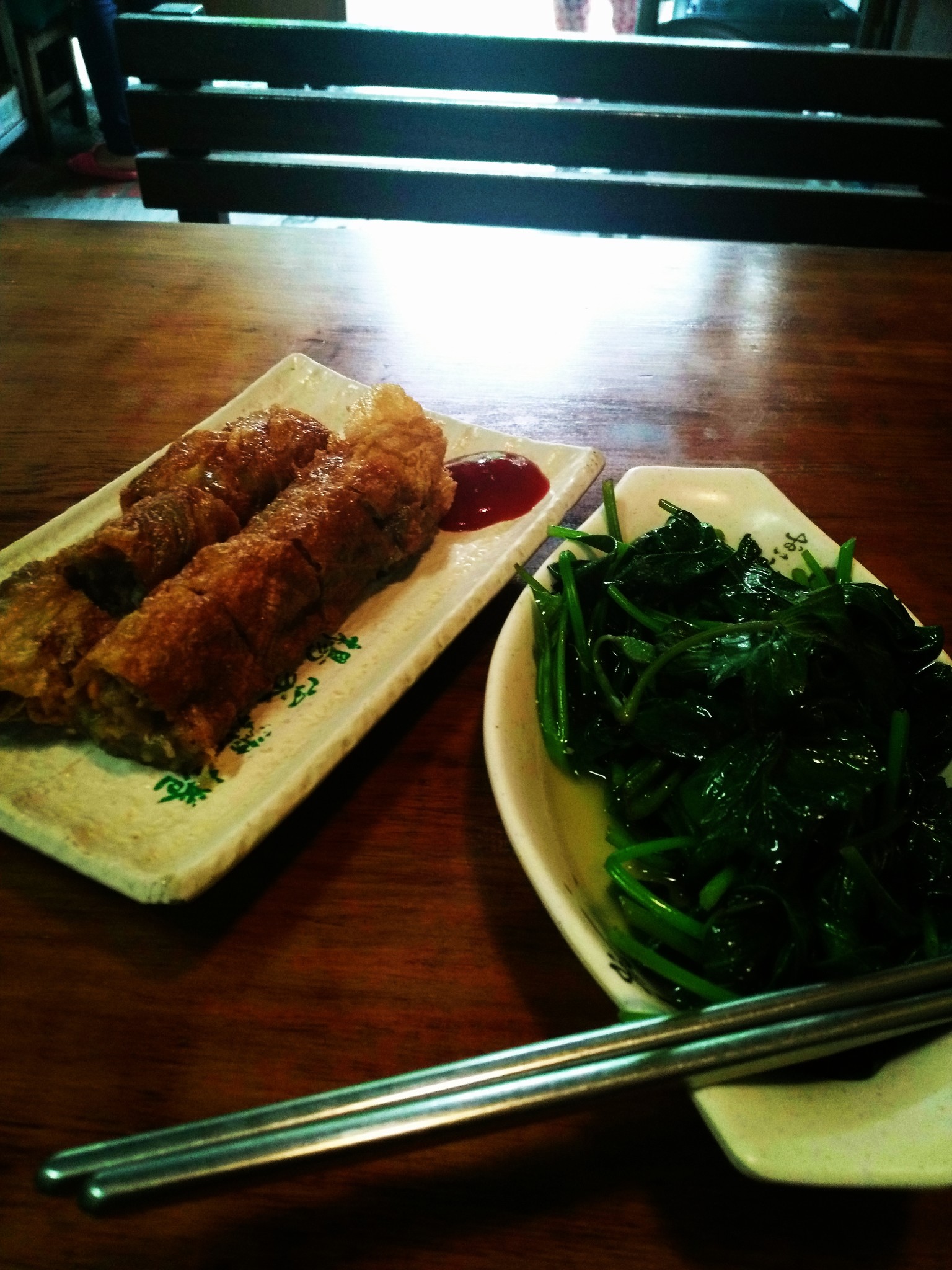 人家游记里推荐的杨家鸡肉卷,嗯,跟没有老婆的老婆饼一个理儿~口味甜甜的,吃多有点腻人,几天没绿色青菜吃的南方人点了个烫青菜,番薯叶,味道还不错哟。
