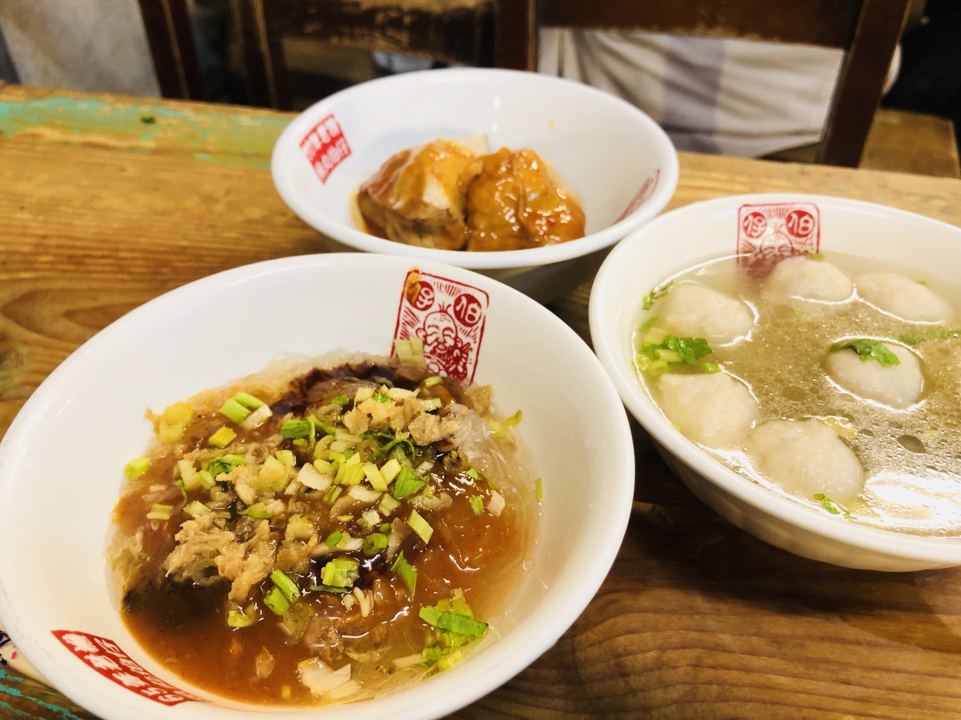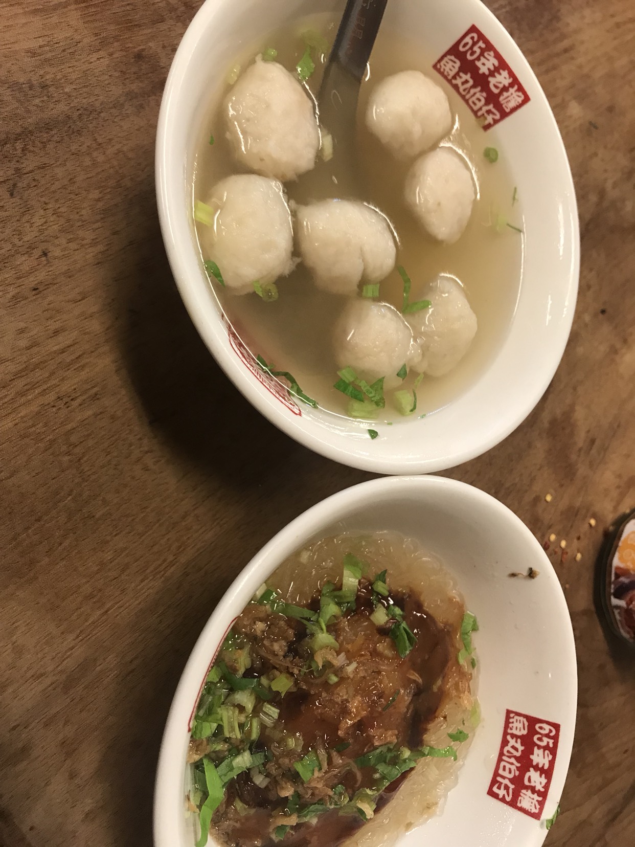 一家65年的老店,几乎都要拼桌。乾冬粉是配上咸鲜的酱料拌着吃的,很开胃。配上一碗手工现做鱼丸,汤味道很清淡,丸子里面没有馅料,吃的是弹牙的口感。