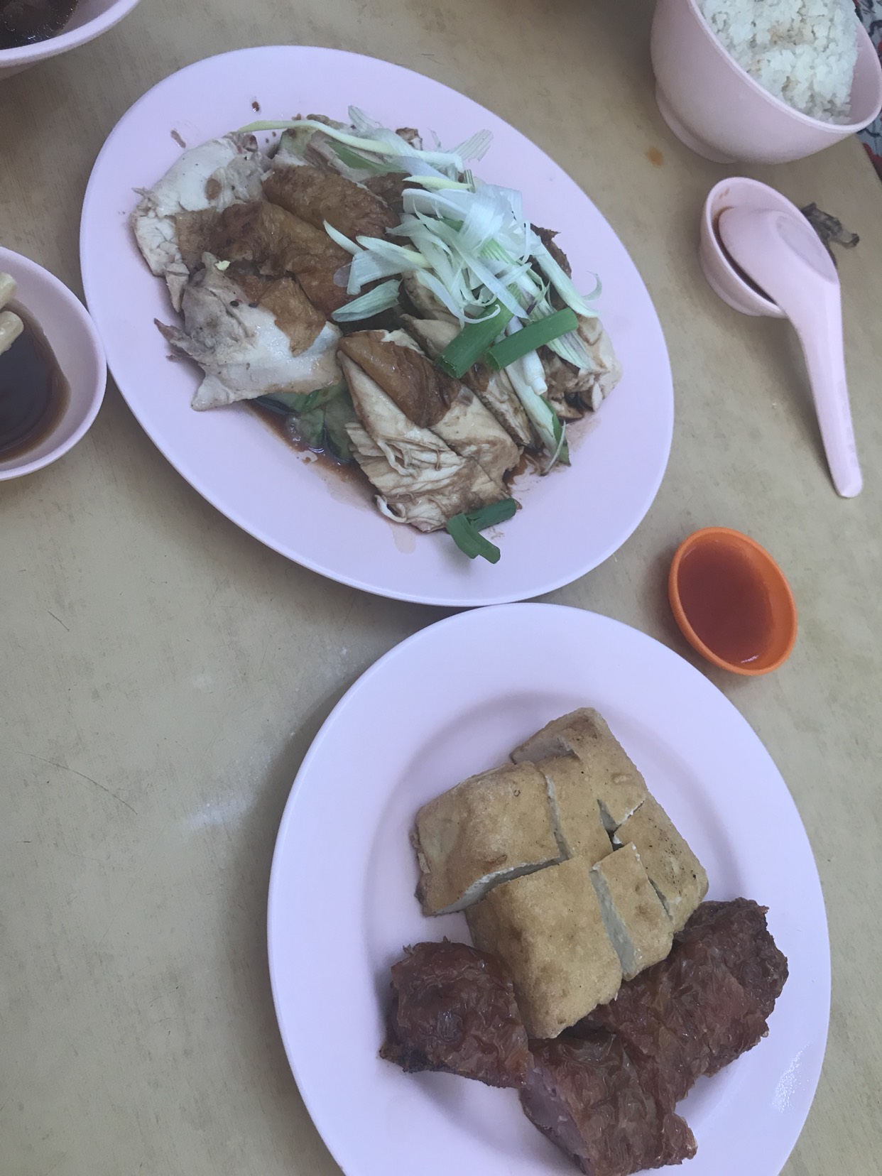 就在汕头街隔壁。而且这里的鸡看上去比较诱人啊。斩鸡的小哥是三少爷,墙上有不少媒体报道,长得好像张敬轩哈哈啊。点了一个白斩鸡一个烧鸡,每个6.5马币,加了一块豆干3马币,两杯喝的大概都在2-3马币左右,价格很实惠。不得不说他的饭真的好吃,鸡油的香夹杂着一丝鸡肉的咸,光是白饭我都能吃一碗。两种鸡各有千秋,选不准的可以点个双拼。(双拼居然还比较便宜???)