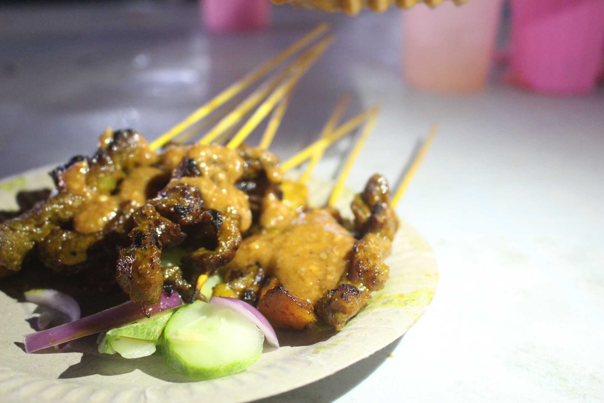 墙裂推荐烤鱿鱼!除了基本的几款槟城美食,我们还挑战了印度菜式~ 夜市的中间位置有几家卖印度的小吃店特别显眼,按奈不住好奇的心决定试试。 店里卖的都是炸物,肉卷、蟹柳、丸子、海鲜都是经过油炸的,一盘盘摆放出来任挑。挑好之后直接给老板算价格,他们还会给淋上很多甜甜的酱,味道尚可接受,但吃多会觉得腻,是个蛮特别的食物吧~当然还有不可错过的烤肉串!配上沙爹酱+甜中带辣的花生酱汁,再加上黄瓜、洋葱一起食用,绝对是一流的味道啊~~~