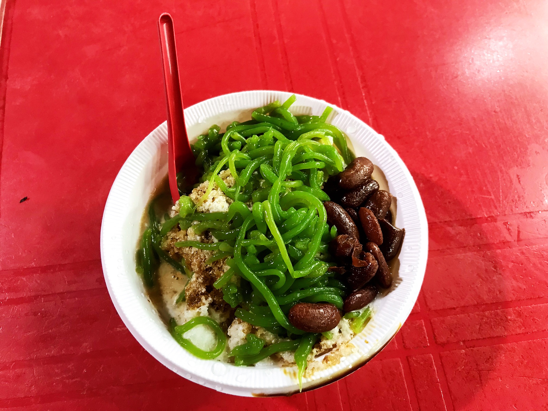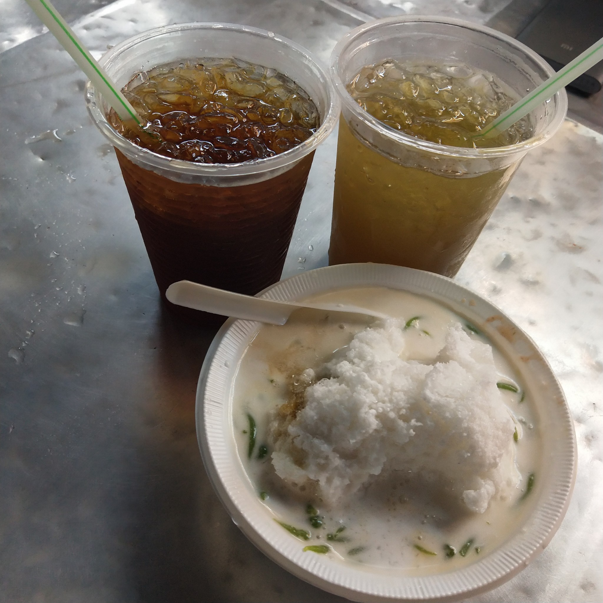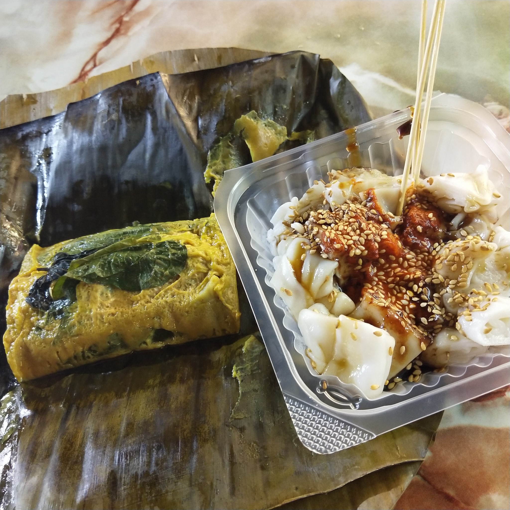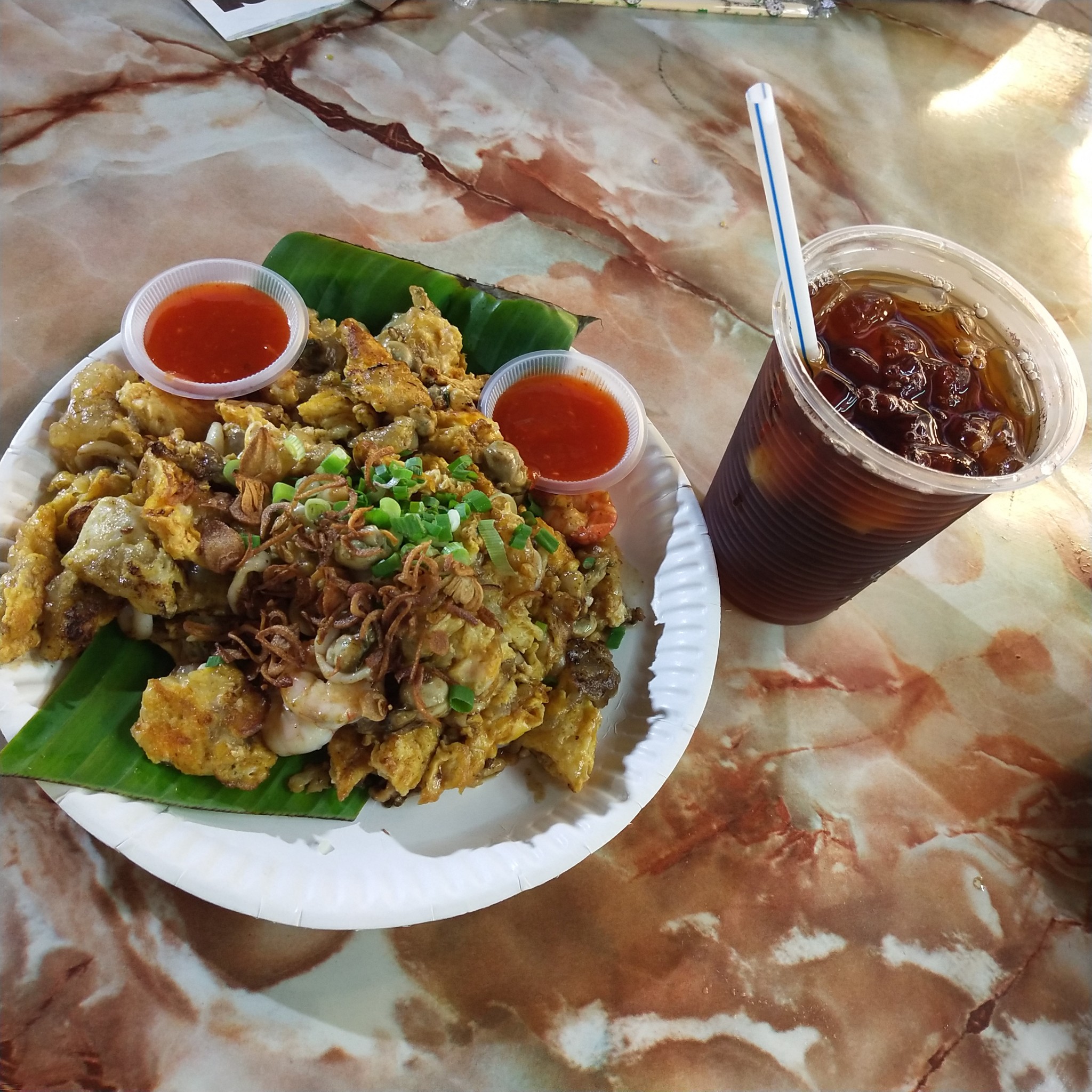 两杯饮料一份煎蕊做开场,饮料忘记点什么了,但这份煎蕊的椰糖不够多,椰浆不够浓,吃起来一般般,没有大宝小食的煎蕊好吃。还买了鲤鱼包和猪肠粉,鲤鱼包是一种很传统的娘惹菜,外面包着应该是香蕉叶子,里面黄黄的可能是沙爹酱还是咖喱酱,中间有一块嫩鱼肉。但是那层酱真的太浓郁了,我实在是接受无能,只能整个包放弃了。然后尝了一块猪肠粉,就是虾膏加酱油膏的味道,重咸又重甜,还有点淡淡的腥味,苍天这两个东西好不适合我。全场最佳我颁给蚝烙,有小鱿鱼有蛤蜊有蚝,加了鸡蛋和淀粉水煎得香香脆脆,比我在厦门和台湾吃得都要新鲜好吃,配上一杯罗汉果龙眼水,结束今晚的晚餐。蚝烙不便宜,要25马币一份,但真的好好吃!罗汉果龙眼水好像是3马币一杯。新关仔角夜市的东西我觉得吧,没有特别的好吃,种类比较多,价格便宜,但是味道一般。最想尝试的福建虾面早早就卖完收摊了,到最后也是随便吃吃填饱肚子就溜了。