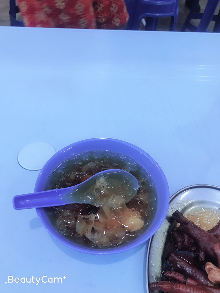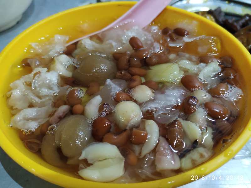 四果汤是槟城有名的甜水饮料,莲子桂圆银耳红豆这四种原料配制的。这家店在汕头街大排档里也很有名,当地人也来这里买。