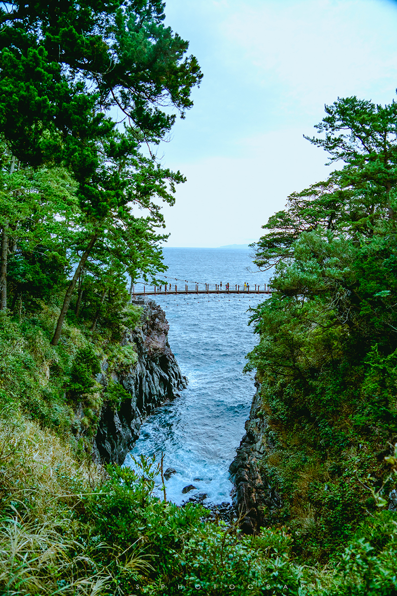城崎海岸位于典型的深入式海岸线上,陡峭的断岩是天城山和大室山火山喷发时流出的溶岩冷却后形成的里亚式海岸。海岸线旁一片郁郁葱葱的原生林台地,临海处礁石嶙峋,海浪奔涌,惊涛拍岸。