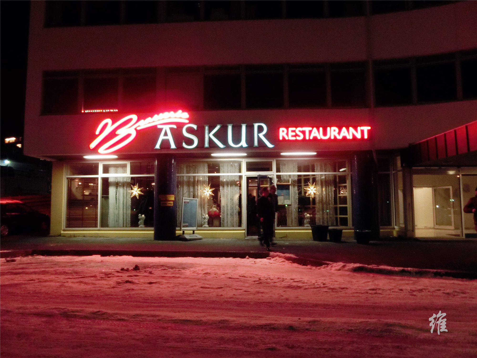 休整一番后前往接待员推荐的牛排馆用晚餐(Askur Restaurant)。飞机上的小三明治已经被颠的消耗殆尽,再加上冰天雪地中十五分钟的步行,当餐馆服务人员说有周日特供自助的时候我们频频点头,要多吃牛羊肉,要保存多一点热量。