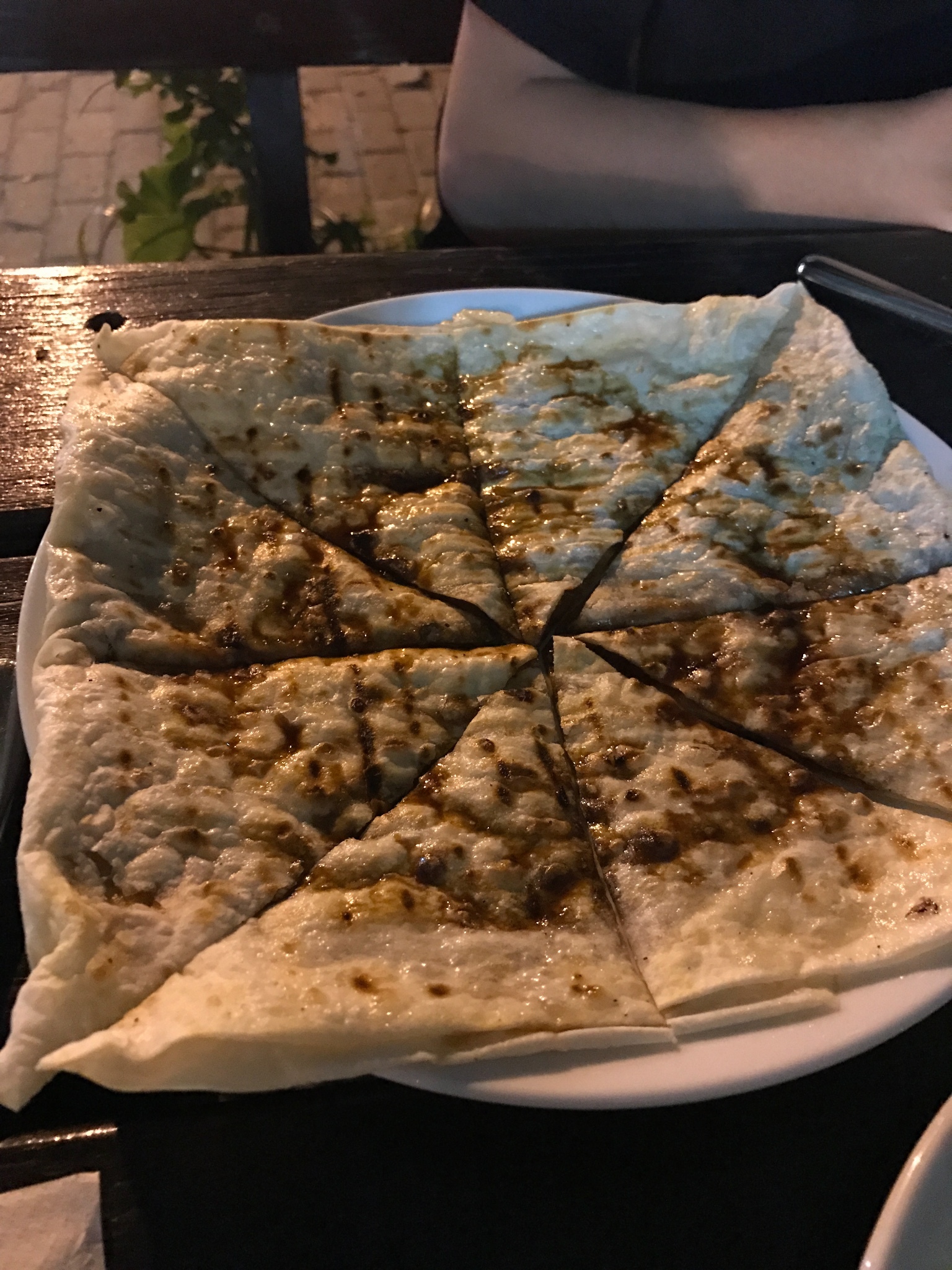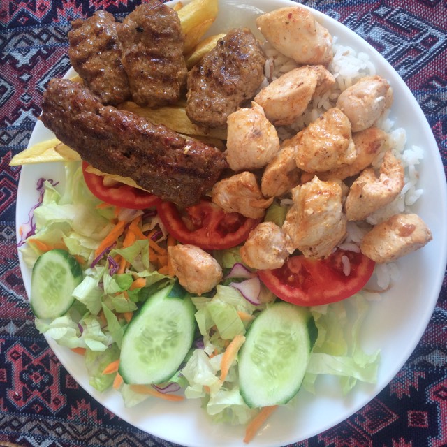 第一餐,我们选择了网上上排第一的Kebab House。网上对它的评价是:“正如许多顾客证实的那样,这家餐厅确实是面向游客的,不过至少可以保证热忱的服务和来自干净厨房的现成菜肴。”这本2015年版的网上评价的时效性可以说非常棒棒了。果不其然,刚坐下 ,店主就递上一份中文菜单,可以说是非常游客了...点了一个主食一份薄饼。