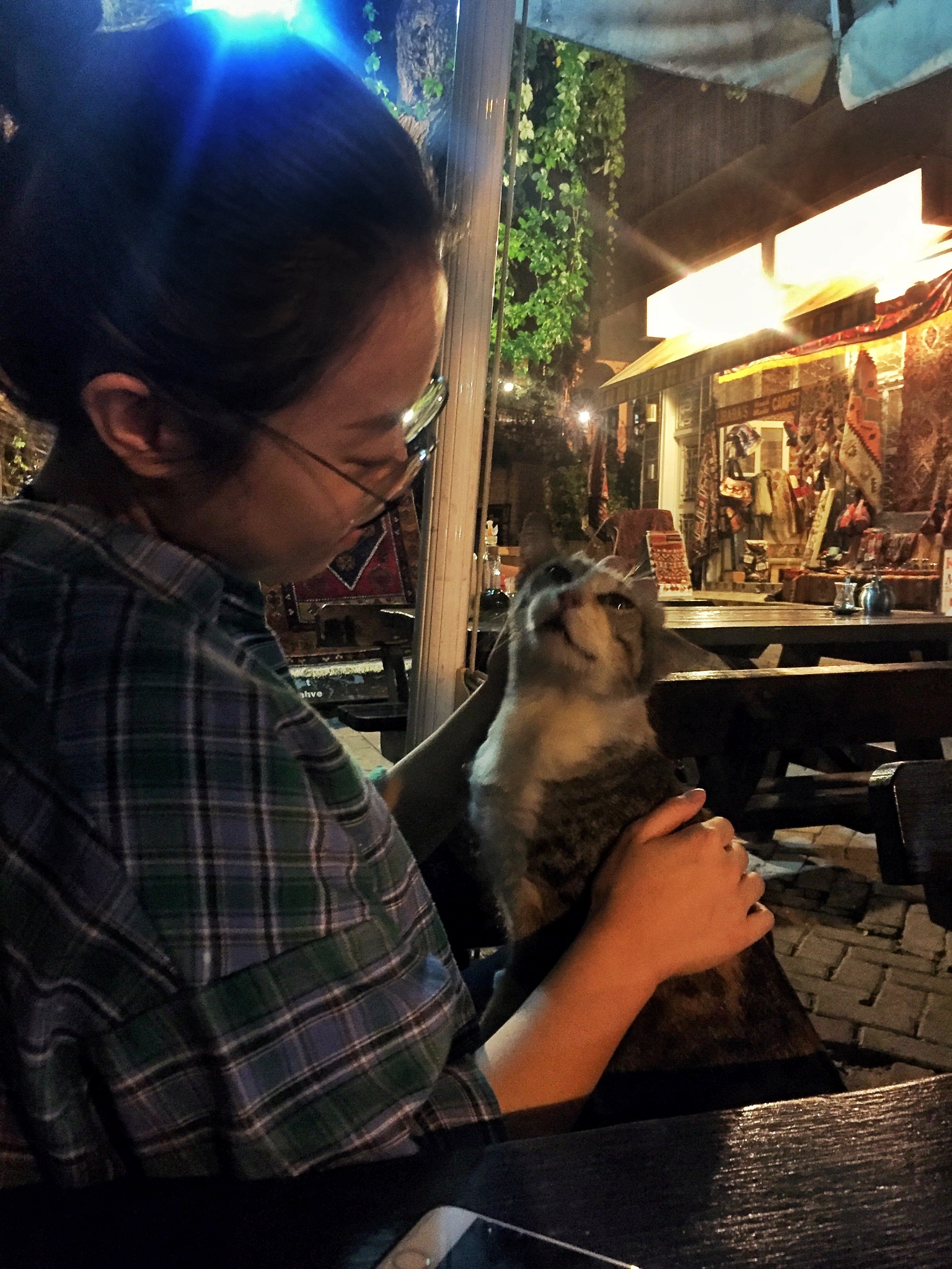 emmm主食味道一般,烤鸡肉很柴,没有什么味道,考牛肉丸也没什么值得一说的。葡萄叶薄饼。被糖浆腌制过的葡萄叶夹在薄饼中间,上面再淋一层糖浆,一口下去除了甜味再没有别的味道。土国的甜品慎点,想象一下每一口都在吃半勺白砂糖的感觉。这是我在土国作死吃的唯两甜品中的第一个。敲黑板,重点来了!出发之前看攻略的时候,基本都会提到土国的猫,文章里它们都是可爱温顺粘人的小天使。在Kebab House吃饭的时候,脚下突然出现了一只小猫。只因为在人群中多看了它一眼,马上就跳到了我腿上,各种求摸摸抱抱举高高,简直成精了,看的人心都化了。一开始画风是这样,非常和谐。