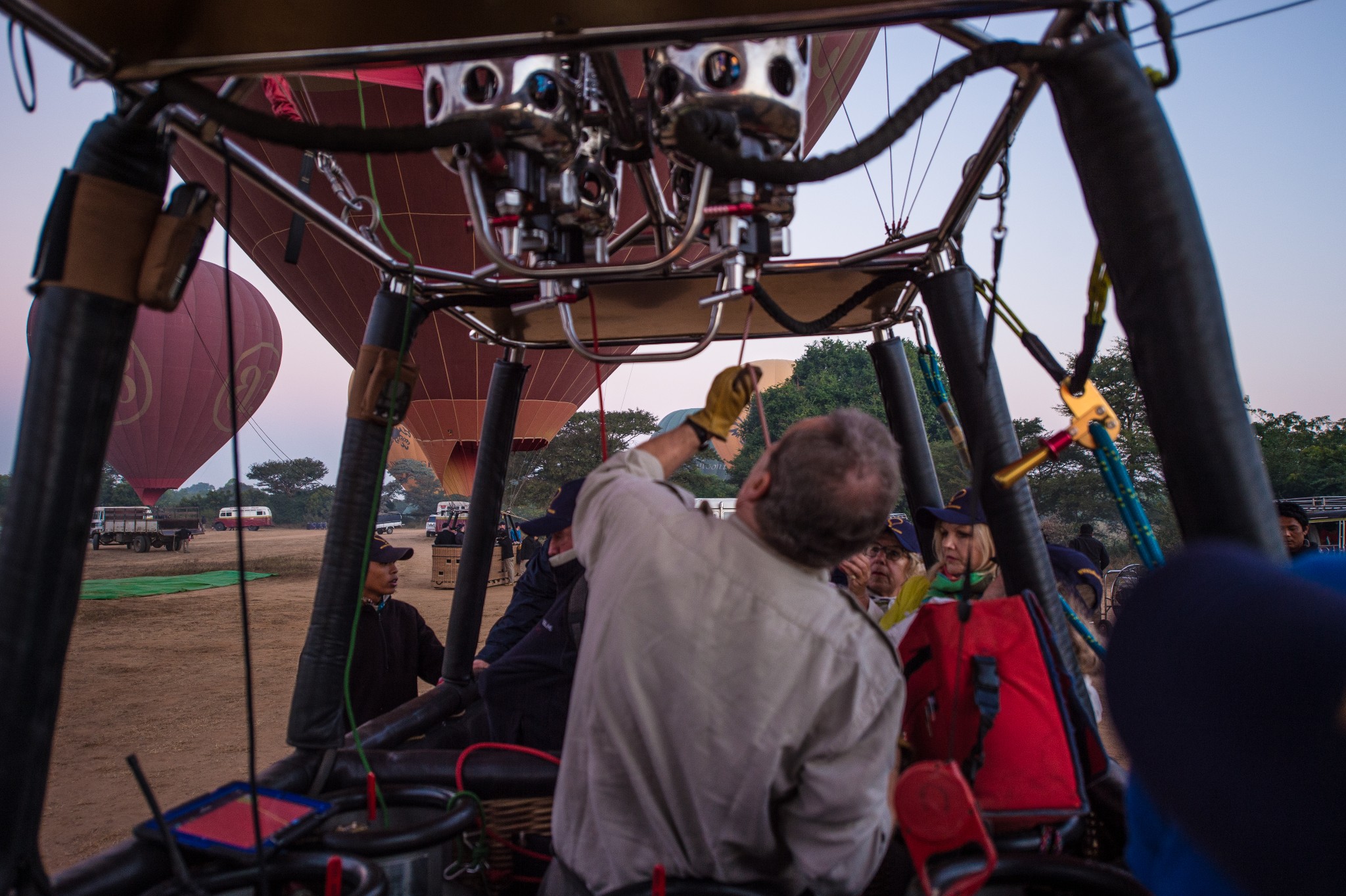 订的普通团330美金(16个人一个热气球),还有一种豪华团要390美金(8个人一个热气球,赠送照片CD)。早晨5点45会有这种红色的小车来接我们去集合的地方。6点多到达集合点给大家派点心和热饮。讲解注意事项。其实热气球是要等太阳出来以后才会起飞,跟之前想象的在热气球上看日出很不一样。所以来到来到集合点后还有很大一会要等。建议还是多穿一点,太阳没出来之前的蒲甘还是很凉的。我们的飞行员Graham,他说他每年有一半的时间在蒲甘这边飞,剩下的都在肯尼亚那边。感觉这么一份工作其实也蛮有趣的。热气球没边有两个篮位,每个篮位可以做4个人,所以整个热气球加上飞行员一共可以坐17个人。开始时工作人员会用一个很大的鼓风机往热气球里充气,充的差不多的时候就会点火,让气球竖直起来,然后我们从两边爬到篮子里。然后Graham会慢慢再点火,调试气球。